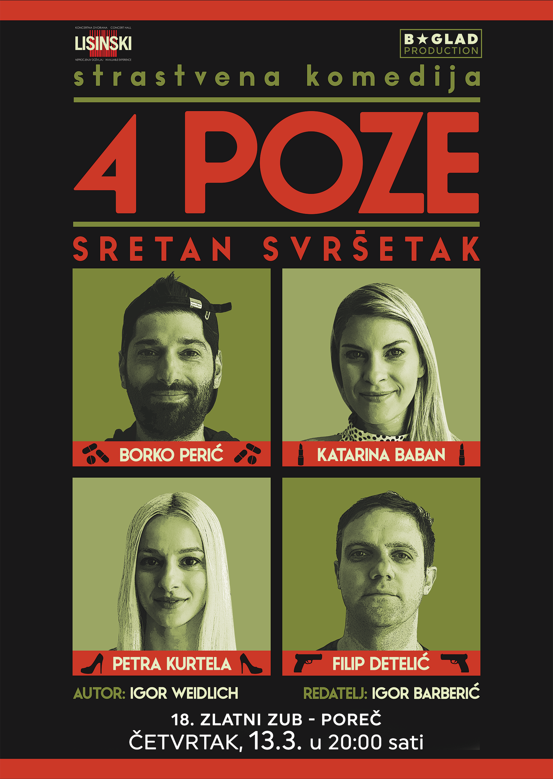 Jak glumački postav na porečkoj je pozornici i sljedeći dan, u četvrtak, 13. ožujka, kada nastupaju nadaleko poznati Katarina Baban, Petra Kurtela, Filip Detelić i Borko Perić u predstavi 4 poze, sretan svršetak B Glad Produkcije. Omnibus sastavljen od pet isprepletenih priča donosi pravi kazališni hit koji bez mistificiranja istražuje muško-ženske odnose, ne štedeći ni tabu-teme.