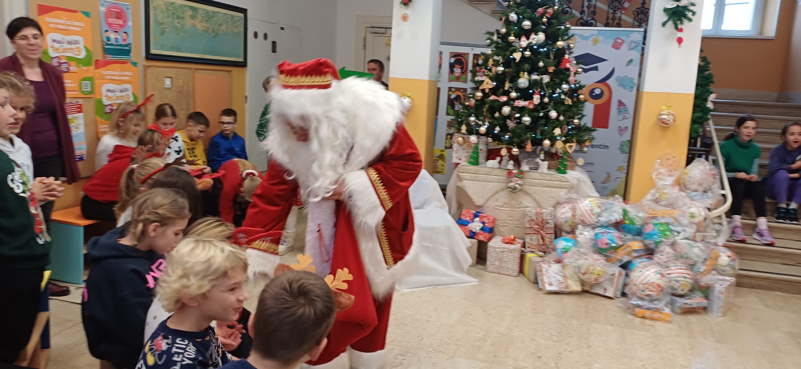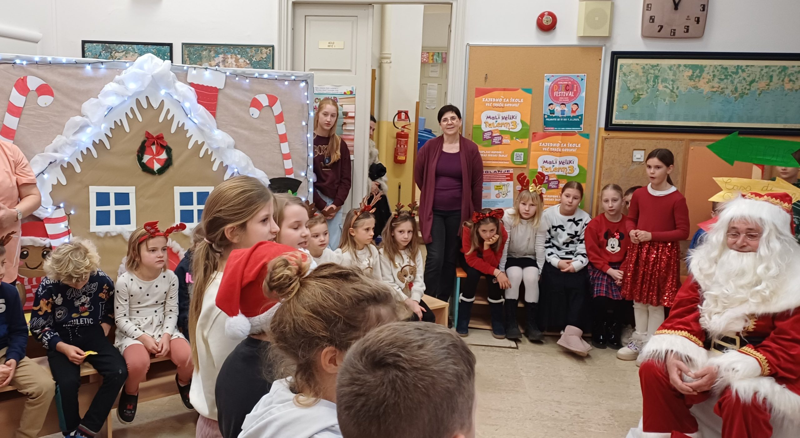 Današnji dan u našoj školi ostat će zapisan kao poseban trenutak ispunjen radošću i božićnom čarolijom. Točno u 11,00 sati učenike od prvog do četvrtog razreda iznenadio je dolazak Djeda Božićnjaka, koji je sa sobom donio vreću punu darova i slatkiša.