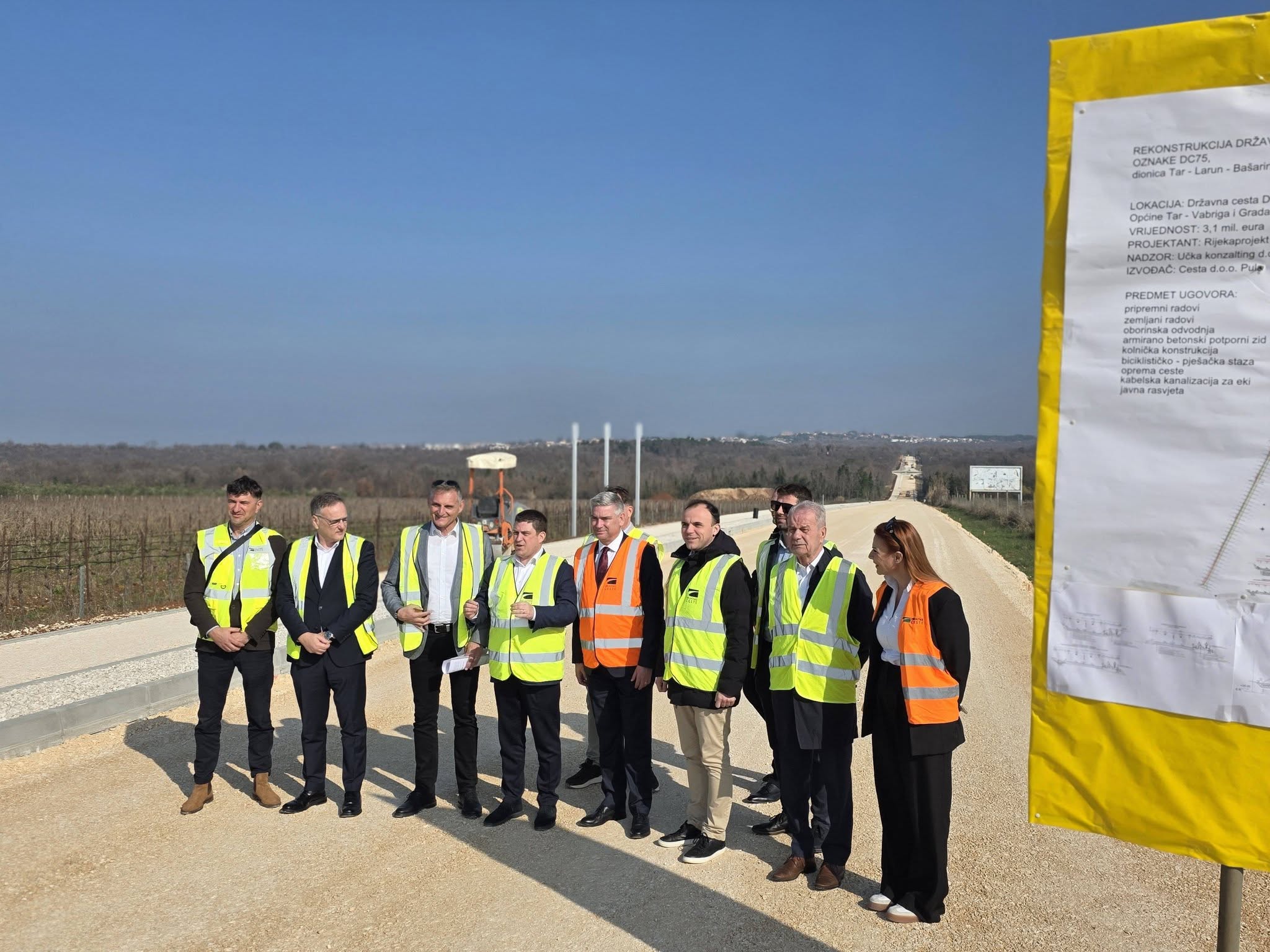Potpredsjednik Vlade Republike Hrvatske i ministar mora, prometa i infrastrukture Oleg Butković boravio je danas u Poreču, gdje je u pratnji porečkog gradonačelnika Lorisa Peršurića, istarskog župana Borisa Miletića, saborskog zastupnika Antona Klimana, direktora Hrvatskih cesta Ivice Budimira te drugih obišao radove na rekonstrukciji državne ceste DC75 na dionici Tar – Larun – Bašarinka. Riječ je o investiciji Hrvatskih cesta, vrijednoj 3,1 milijun eura, kojom se unapređuje jedna od ključnih prometnica koja povezuje naselja Poreštine i šire područje zapadne Istre. Prema najavama izvođača, dovršetak radova i otvaranje dionice očekuje se do početka lipnja, zajedno sa svom pratećom infrastrukturom i biciklističkom stazom.