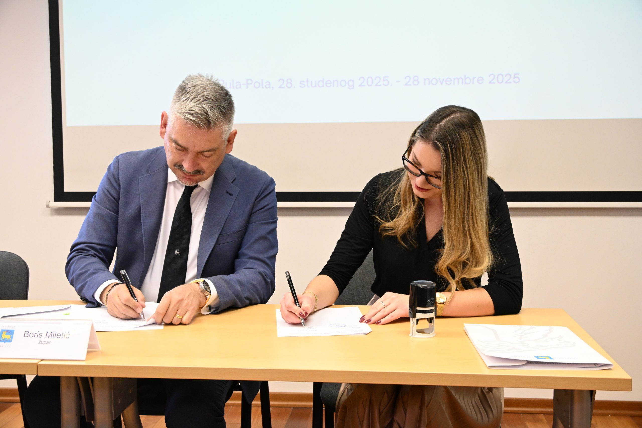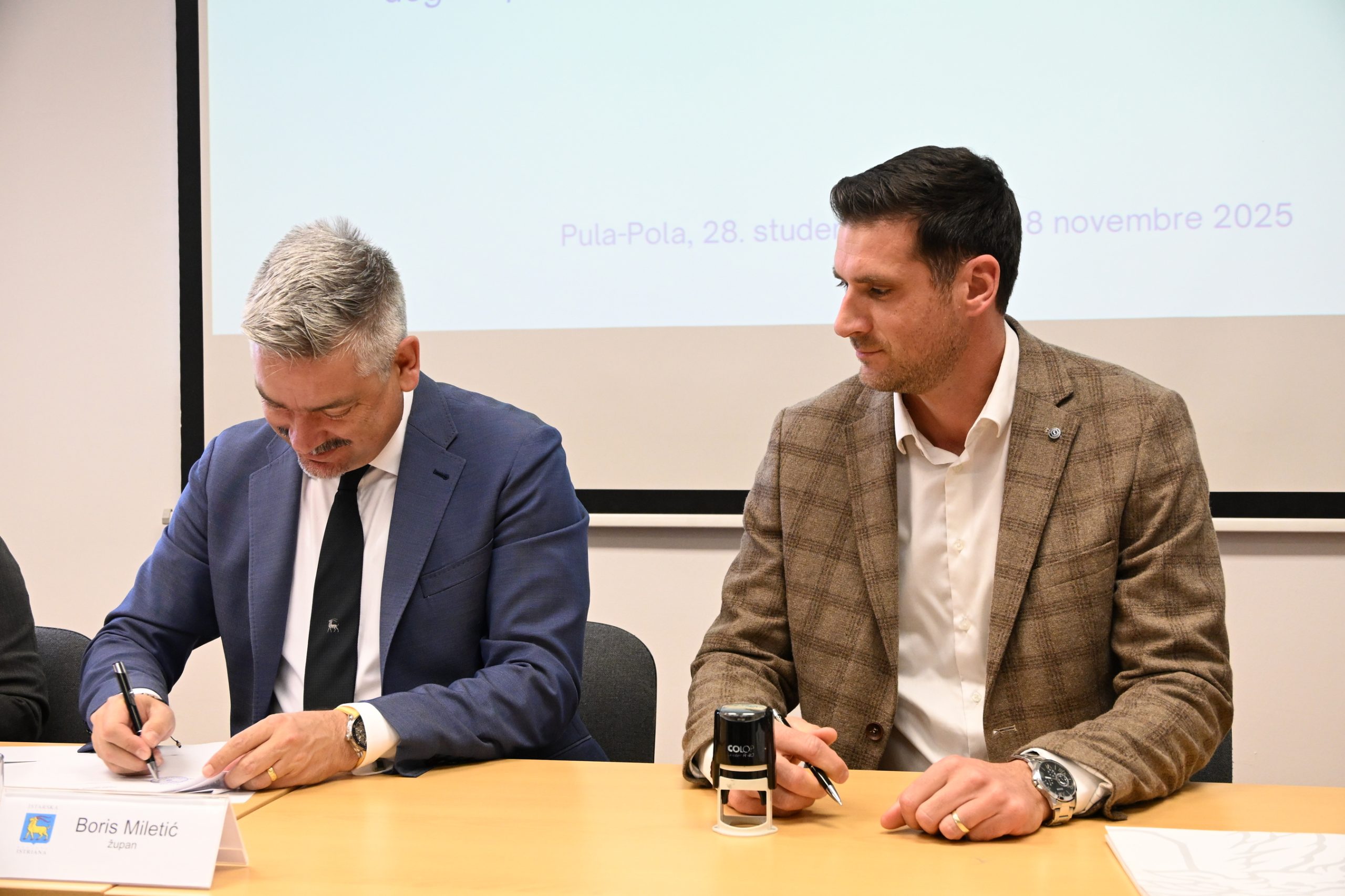 Potpisivanju ugovora prisustvovali su i pročelnik Upravnog odjela župana Ivan Glušac i pročelnica Upravnog odjela za obrazovanje, sport i tehničku kulturu Patricia Percan.