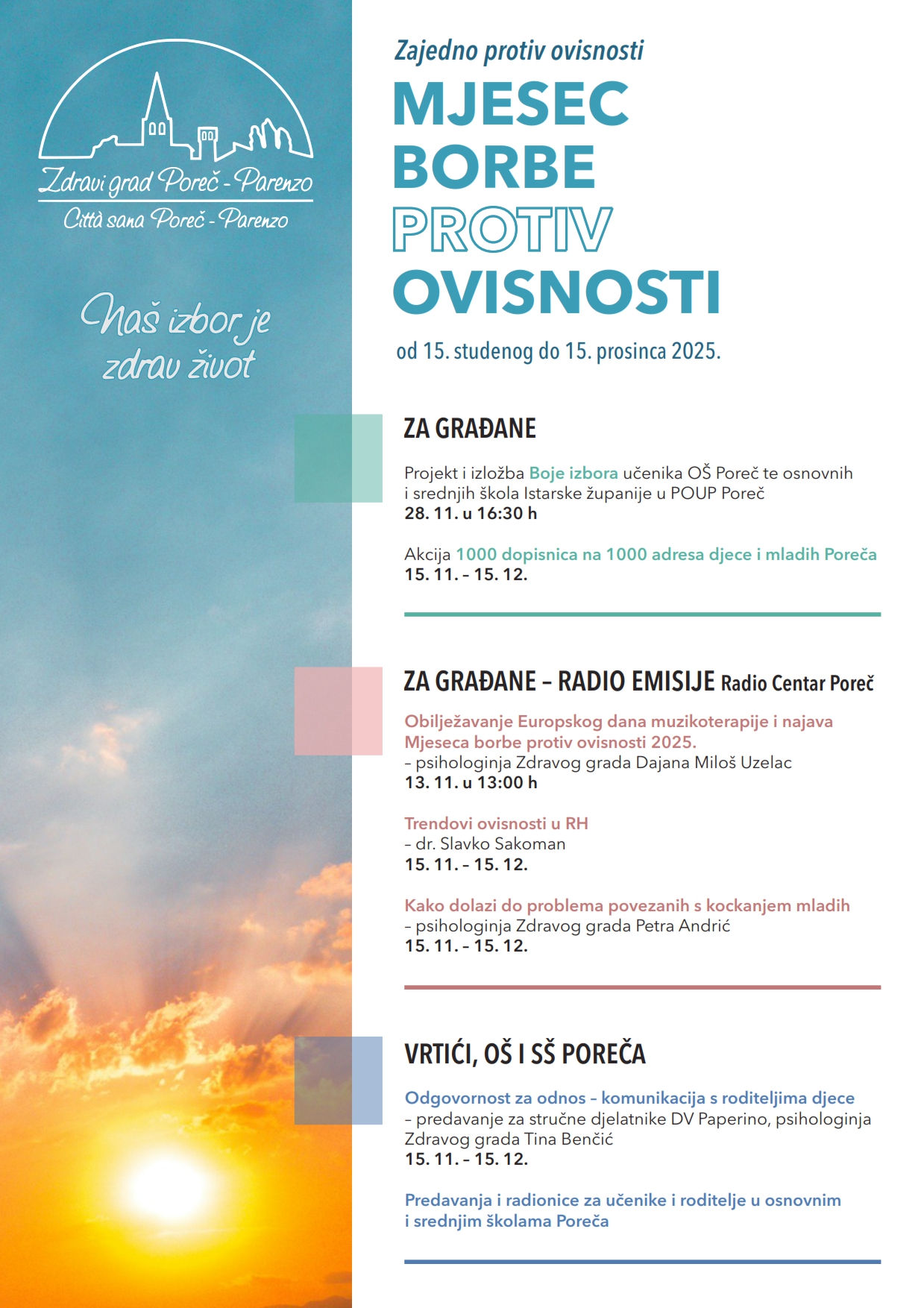 Između 15. studenoga i 15. prosinca u Republici Hrvatskoj obilježavamo Mjesec borbe protiv ovisnosti. Svake godine u navedenom razdoblju obilježavanje se provodi s ciljem upozoravanja cjelokupne javnosti na problem zlouporabe svih oblika sredstava ovisnosti na svim razinama: osobnoj, obiteljskoj i opće društvenoj razini. U Poreču obilježavanje Mjeseca borbe protiv ovisnosti (MBO) na razini zajednice godinama koordinira Zdravi grad Poreč, a ono predstavlja krunu cjelogodišnjeg programa preventivnih zaštitnih aktivnosti u našem gradu ‘Zajedno protiv ovisnosti’ Grada Poreča. Obilježava se kroz bogat program prvenstveno usmjeren na djecu i mlade – učenike porečkih osnovnih i srednjih škola te njihove roditelje i nastavnike, ali i kroz aktivnosti i medijske istupe za širu javnost. U pripremu aktivnosti uključeni su stručnjaci Zdravog grada Poreč te stručne službe porečkih škola kao i gosti – vanjski suradnici, renomirani stručnjaci u području prevencije i tretmana ovisnosti te predstavnici MUP-a.