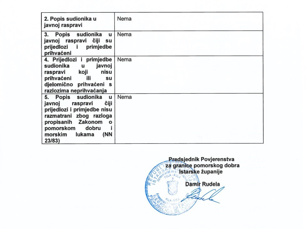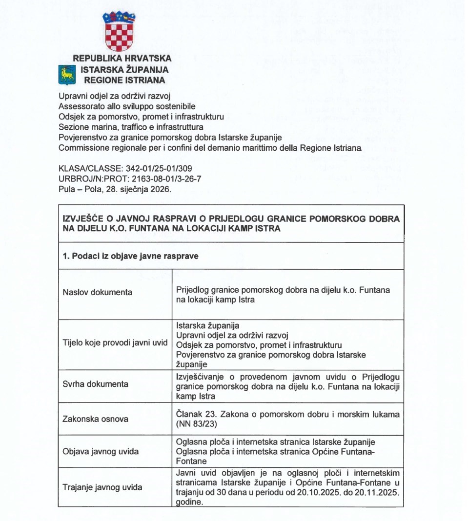 Temeljem članka 23. stavka 5. i 6. Zakona o pomorskom dobru i morskim lukama (“Narodne novine”, broj 83/23, dalje: Zakon), Povjerenstvo za granice pomorskog dobra Istarske županije pripremilo je Izvješće o javnoj raspravi o Prijedlogu granice pomorskog dobra na dijelu k.o. Funtana na lokaciji kamp Istra.