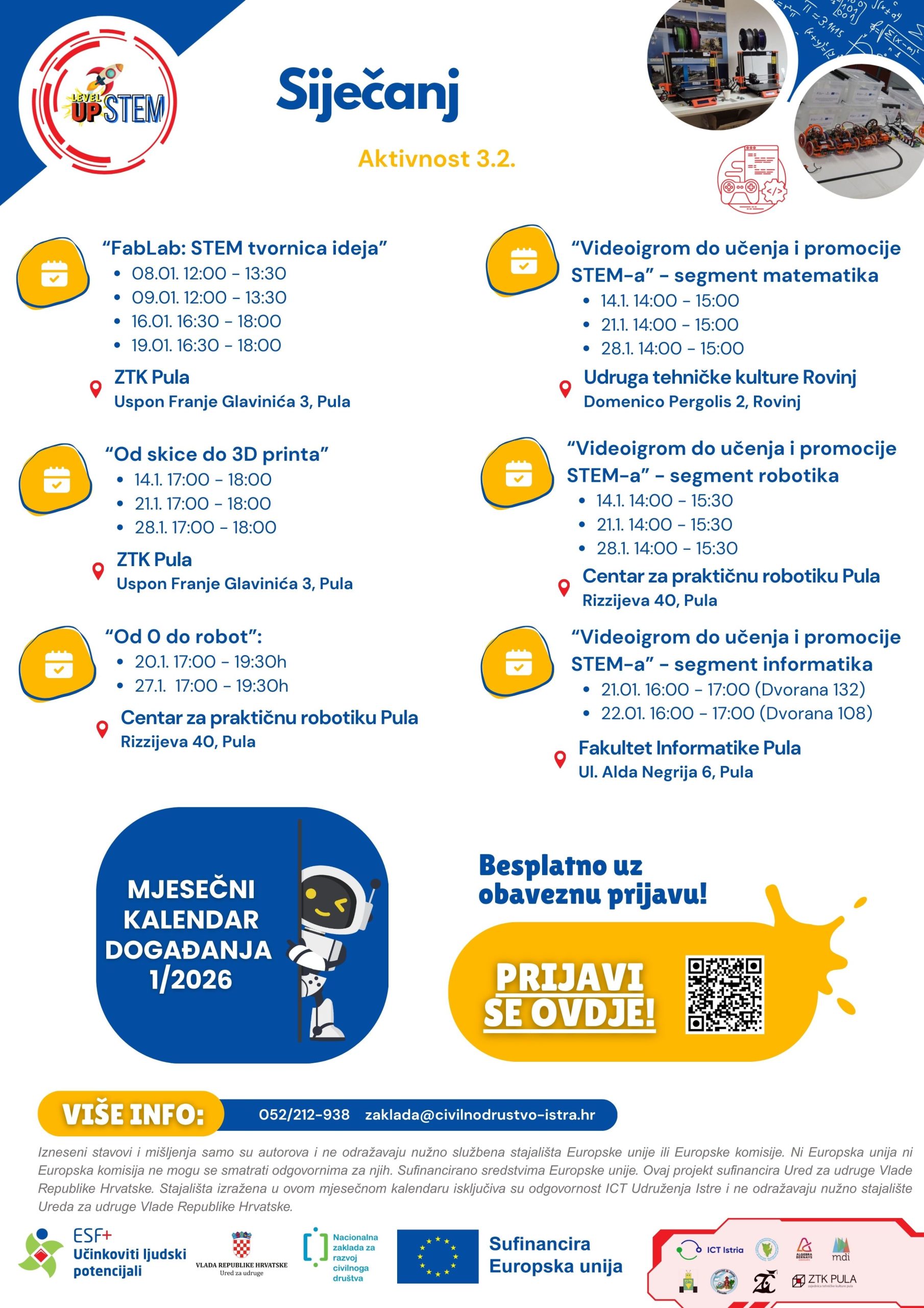 ICT Istra u sklopu projekta „LevelUP STEM: Istraži, nauči, stvori!” tijekom siječnja 2026. s partnerima organizira besplatne STEM radionice namijenjene učenicima osnovnoškolske i srednjoškolske dobi. Cilj radionica je poticanje interesa za STEM područja kroz kreativan, praktičan i suvremen pristup učenju, uz korištenje inovativnih tehnologija.