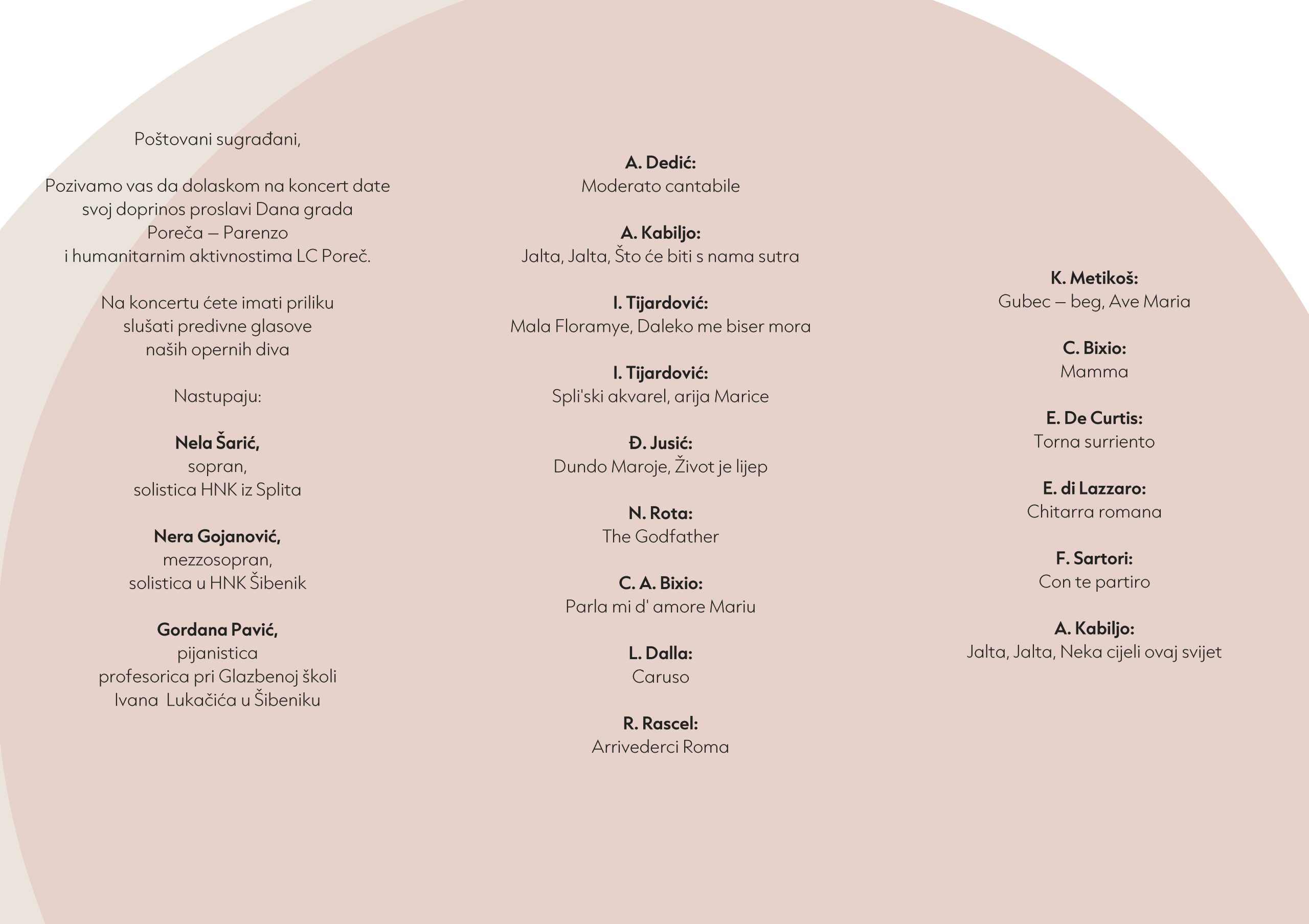 Nastupaju operne solistice Nela Šarić, sopran i Nera Gojanović, mezzosopran, uz pratnju profesorice Gordana Pavić, klavir.