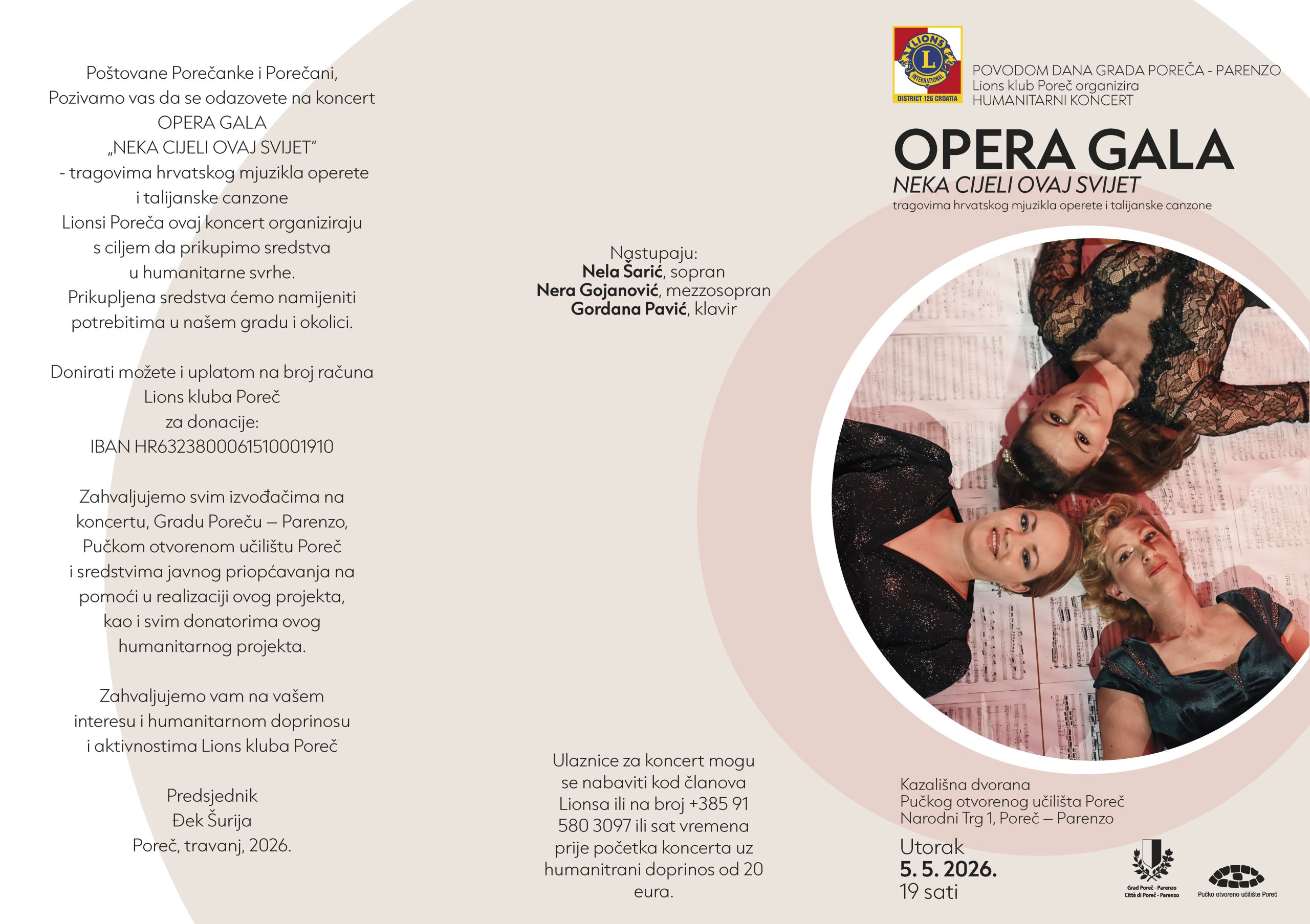 Lions club Poreč poziva na opera gala večer „NEKA CIJELI OVAJ SVIJET“ – tragovima hrvatskog mjuzikla operete i talijanske canzone