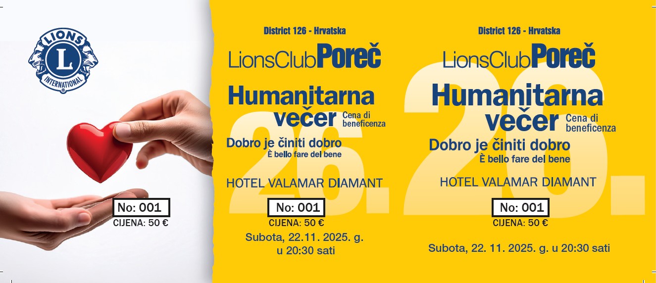 LIONS KLUB POREČ po 26. PUT ORGANIZIRA TRADICIONALNU HUMANITARNU VEČER koja će se održati 22. 11. 2025. godine (subota) u 20.30 sati u hotelu VALAMAR DIAMANT Poreč, a koja se i ove godine održava POVODOM BLAGDANA SV. MAURA, zaštitnika Poreča.