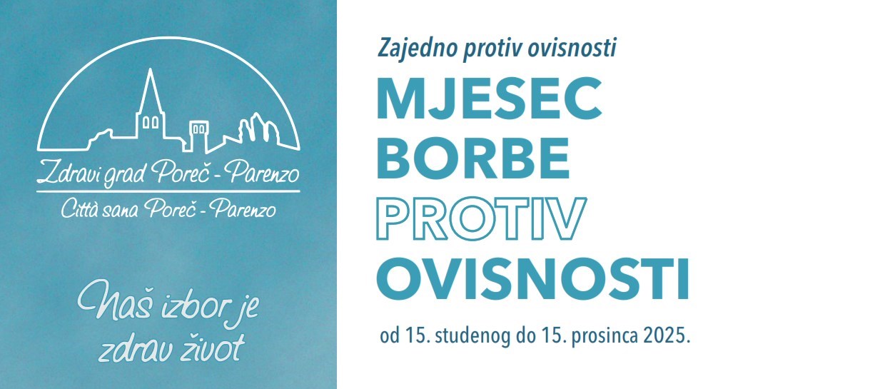 Između 15. studenoga i 15. prosinca u Republici Hrvatskoj obilježavamo Mjesec borbe protiv ovisnosti. Svake godine u navedenom razdoblju obilježavanje se provodi s ciljem upozoravanja cjelokupne javnosti na problem zlouporabe svih oblika sredstava ovisnosti na svim razinama: osobnoj, obiteljskoj i opće društvenoj razini. U Poreču obilježavanje Mjeseca borbe protiv ovisnosti (MBO) na razini zajednice godinama koordinira Zdravi grad Poreč, a ono predstavlja krunu cjelogodišnjeg programa preventivnih zaštitnih aktivnosti u našem gradu ‘Zajedno protiv ovisnosti’ Grada Poreča. Obilježava se kroz bogat program prvenstveno usmjeren na djecu i mlade – učenike porečkih osnovnih i srednjih škola te njihove roditelje i nastavnike, ali i kroz aktivnosti i medijske istupe za širu javnost. U pripremu aktivnosti uključeni su stručnjaci Zdravog grada Poreč te stručne službe porečkih škola kao i gosti – vanjski suradnici, renomirani stručnjaci u području prevencije i tretmana ovisnosti te predstavnici MUP-a.
