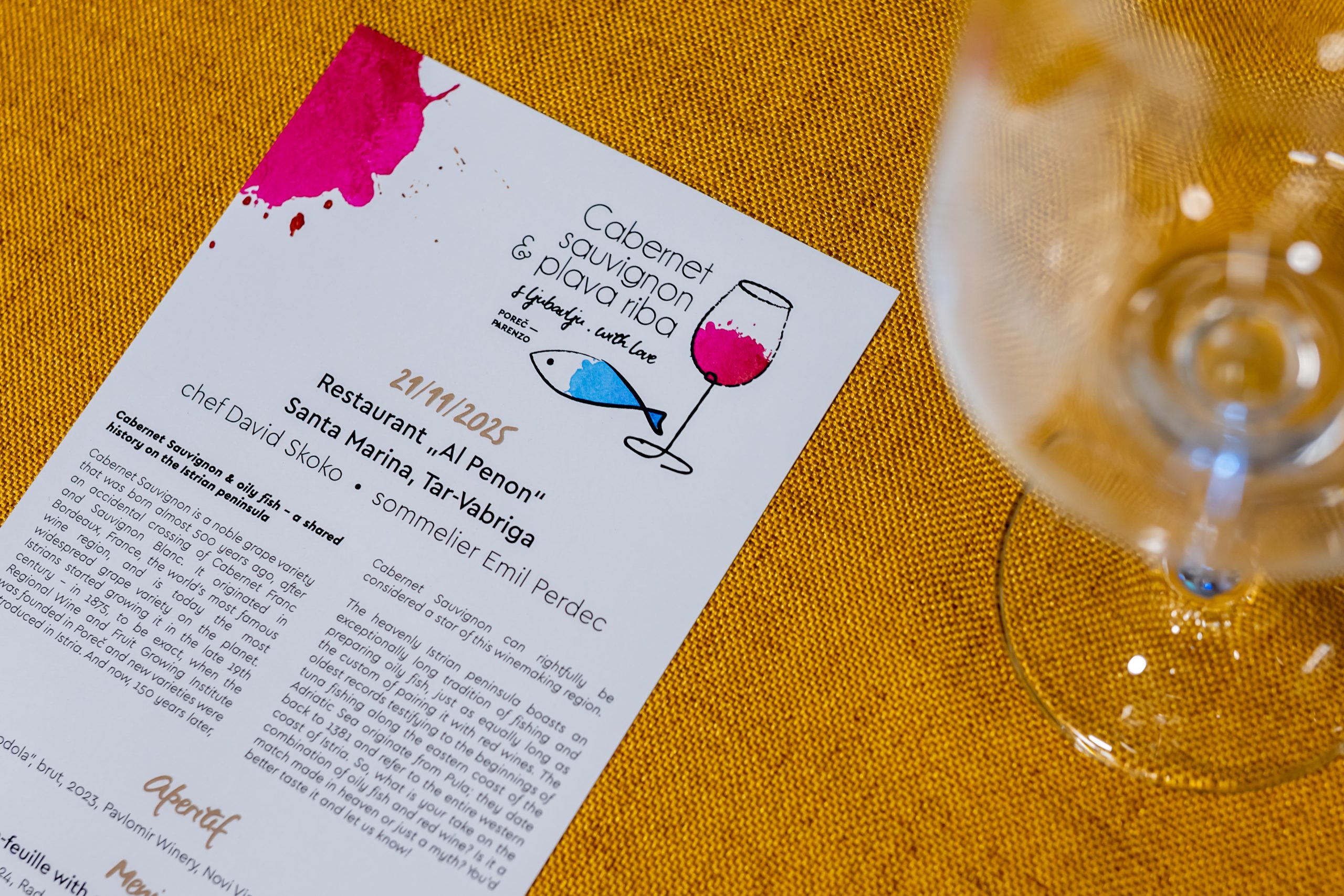 Večer je moderirao sommelier Emil Perdec, ističući kroz predstavljanje sljedova važnost valorizacije sorte Cabernet Sauvignon, njezine raznolikosti i potencijala u mediteranskom kontekstu, kao i jedinstvenu ulogu plave ribe u održivoj gastronomiji.