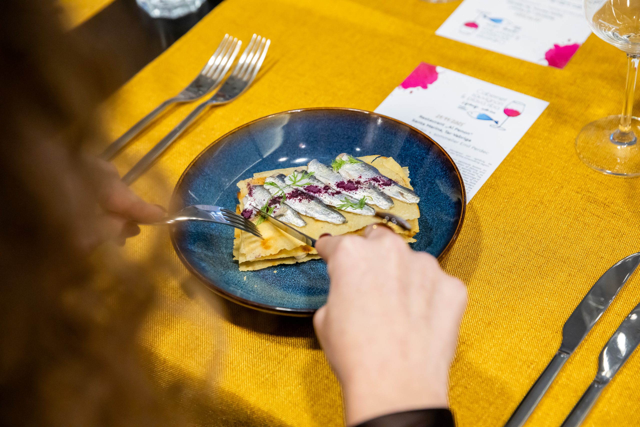 Pod kulinarskim vodstvom chef-a Davida Skoke, gosti su uživali u pažljivo osmišljenom meniju koji je naglašavao raznolikost i ljepotu plave ribe te njenu harmoniju s Cabernet Sauvignonom. Prvi slijed, millefoglie sa sardelama i tapenadom, sljubljen je s Roseom 2024 vinarije Radovan, koji je svojom svježinom savršeno zaokružio ovaj moderno interpretirani klasični okus Mediterana.