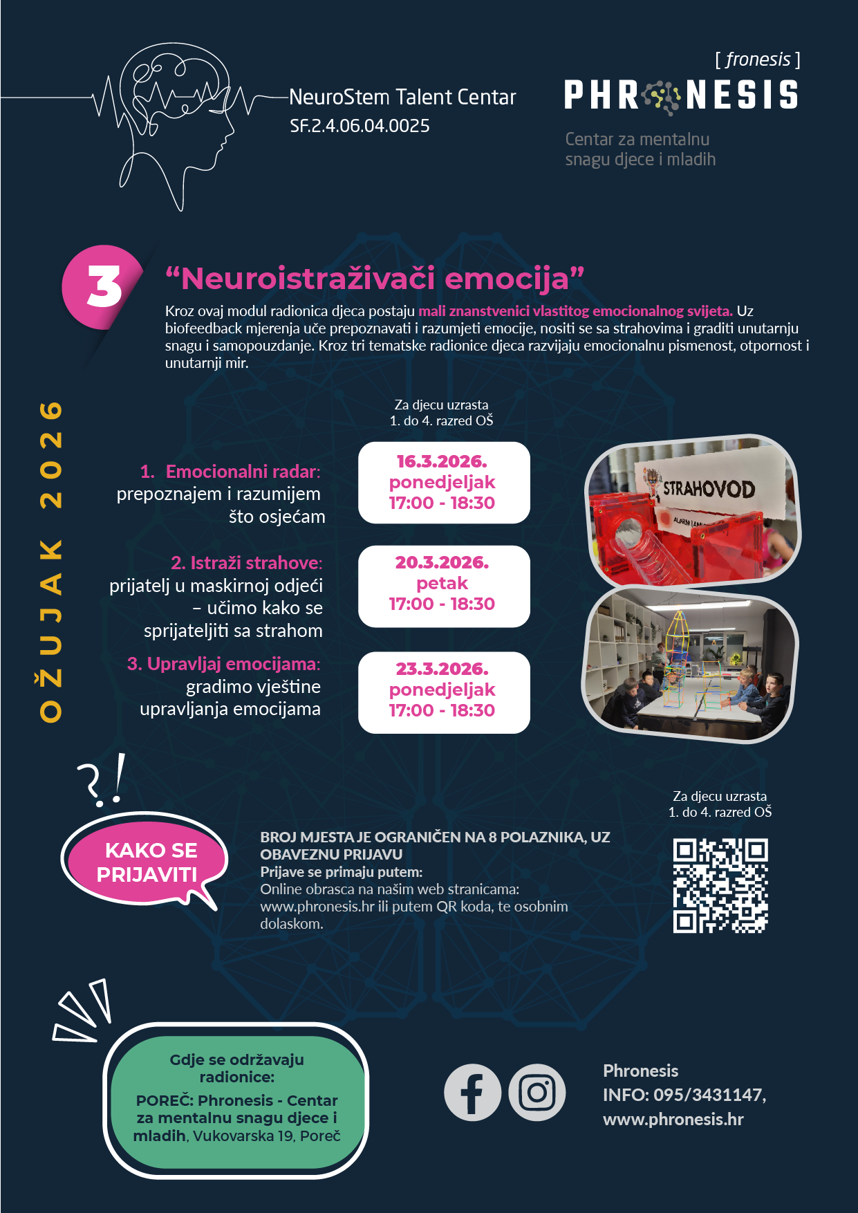 Za mlađe osnovnoškolce, od 1. do 4. razreda, organiziran je i modul „Neuroistraživači emocija“, koji se također održava u Centru Phronesis, Vukovarska 19, Poreč. Kroz tri tematske radionice djeca postaju mali znanstvenici vlastitog emocionalnog svijeta te uz biofeedback mjerenja uče prepoznavati i razumjeti emocije, nositi se sa strahovima i razvijati unutarnju snagu i samopouzdanje. Radionice se održavaju 16., 20. i 23. ožujka od 17:00 do 18:30, a maksimalan broj sudionika po radionici je osam.