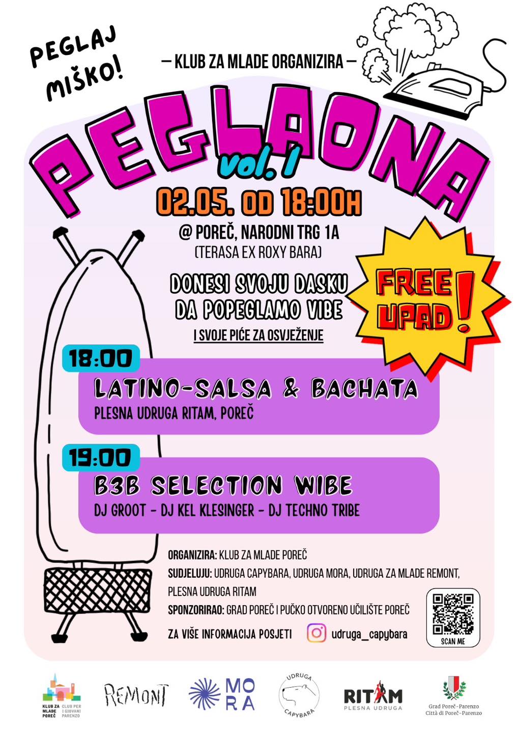 Povodom Dana Grada Poreča, u organizaciji Kluba za mlade Poreč, Udruga Capybara donosi event inspiriran belgijskim studentima koji javne prostore pretvaraju u plesne zone – uz daske za peglanje kao stolove.