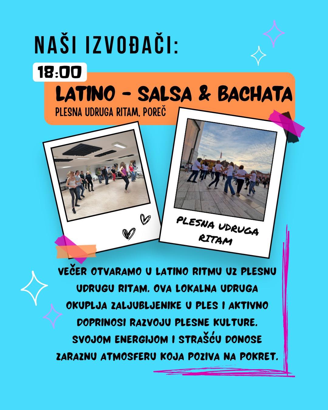 Večer otvaramo uz plesnu udrugu Ritam , koja svojim energičnim nastupom i zaraznim ritmovima donosi pravu latino atmosferu i poziva sve na ples.