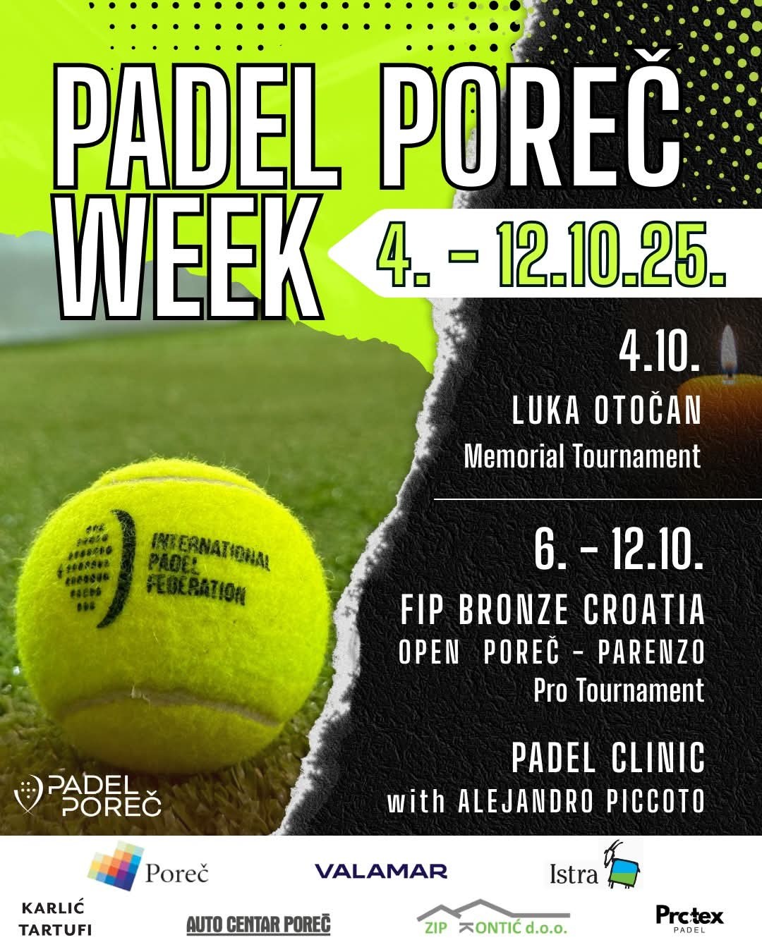 Od 4. do 12. listopada na terenima Padel Poreč Centra (pored Motodroma) održava se Padel Poreč Week – sportsko događanje koje okuplja zaljubljenike u ovaj sve popularniji sport. Događanje otvara u subotu, 4. listopada, humanitarni turnir Memorijal Luka Otočan, s početkom u 10 sati. Kotizacija je dobrovoljna, a sva sredstva bit će donirana u humanitarne svrhe. Prijave su moguće putem Wansport aplikacije ili WhatsAppa na broj +385 91 6024412. Glavni turnir održava se od 6. do 12. listopada – FIP BRONCE CROATIA 2025, prestižni profesionalni turnir s nagradnim fondom od 10.000 eura, koji u Poreč dovodi vrhunske svjetske igrače i nezaboravne padel mečeve. Pridružite se i uživajte u vrhunskim mečevima, energiji sporta i zajedništvu!