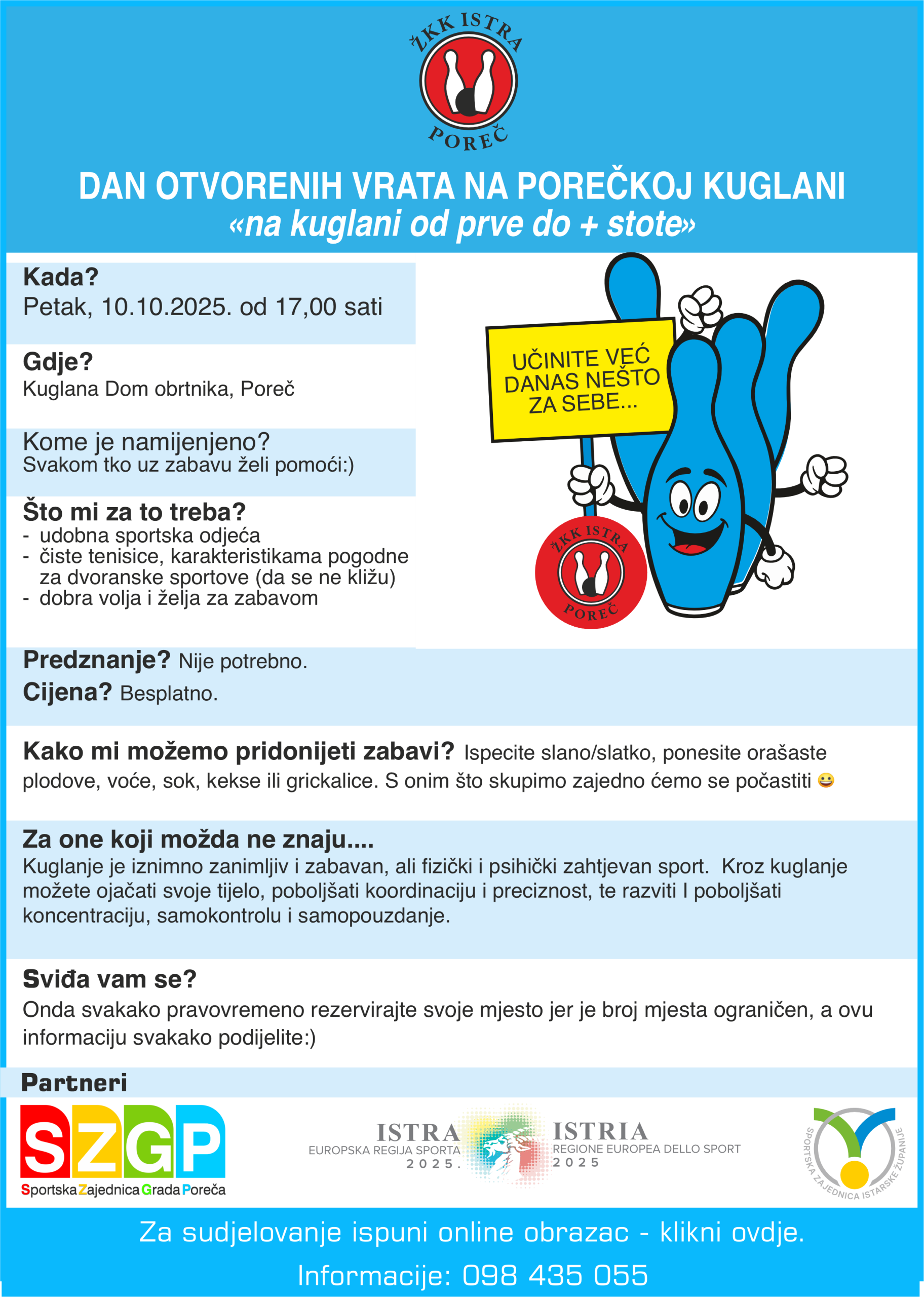 Povodom izbora Istarske županije kao europska regija sporta u porečkoj kuglani Doma obrtnika u petak 10.10.2025. od 17,00 sati održati će se kuglački turnir pod nazivom “Dan otvorenih vrata na porečkoj kuglani – na kuglani od prve do stote”.