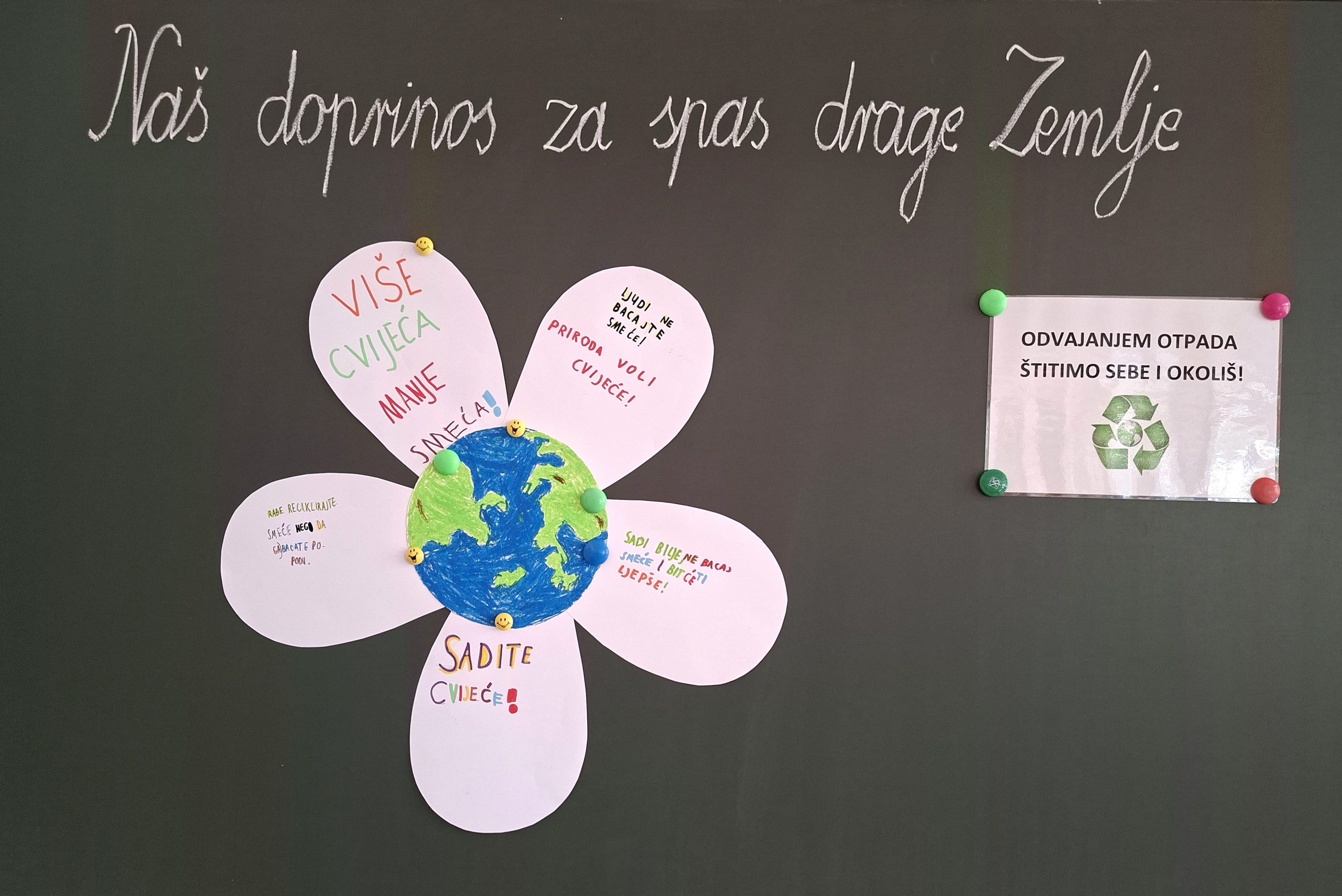 U radionici „Naš doprinos za spas drage Zemlje“, učenici su naučili i uvježbali pravilno razvrstavati otpad kako bi stvorili naviku razvrstavanja otpada i osvijestili važnost zaštite okoliša za sve nas. U razvrstanom otpadu pronalazili su sve što bi mogli ponovo upotrijebiti primjenjujući postupke recikliranja i ponovne uporabe. Izrađivali su nakit od recikliranog materijala, oslikavali su staklenke/limenke praveći vaze za cvijeće ili posude za bojice, bojali su razredni spremnik za papir, pravili su hotel za kukce od plastične boce, presađivali su i sijali cvijeće, ukrašavali male platnene vrećice za nakit.