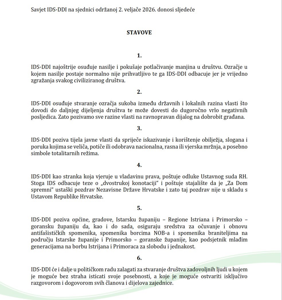 Na drugoj sjednici Savjeta IDS-a, održanoj sinoć u Pazinu, nakon otvorene i sadržajne rasprave, doneseni su zajednički stavovi o aktualnom društveno-političkom ozračju, obilježenom sve izraženijim podjelama, netolerancijom i nasiljem.
