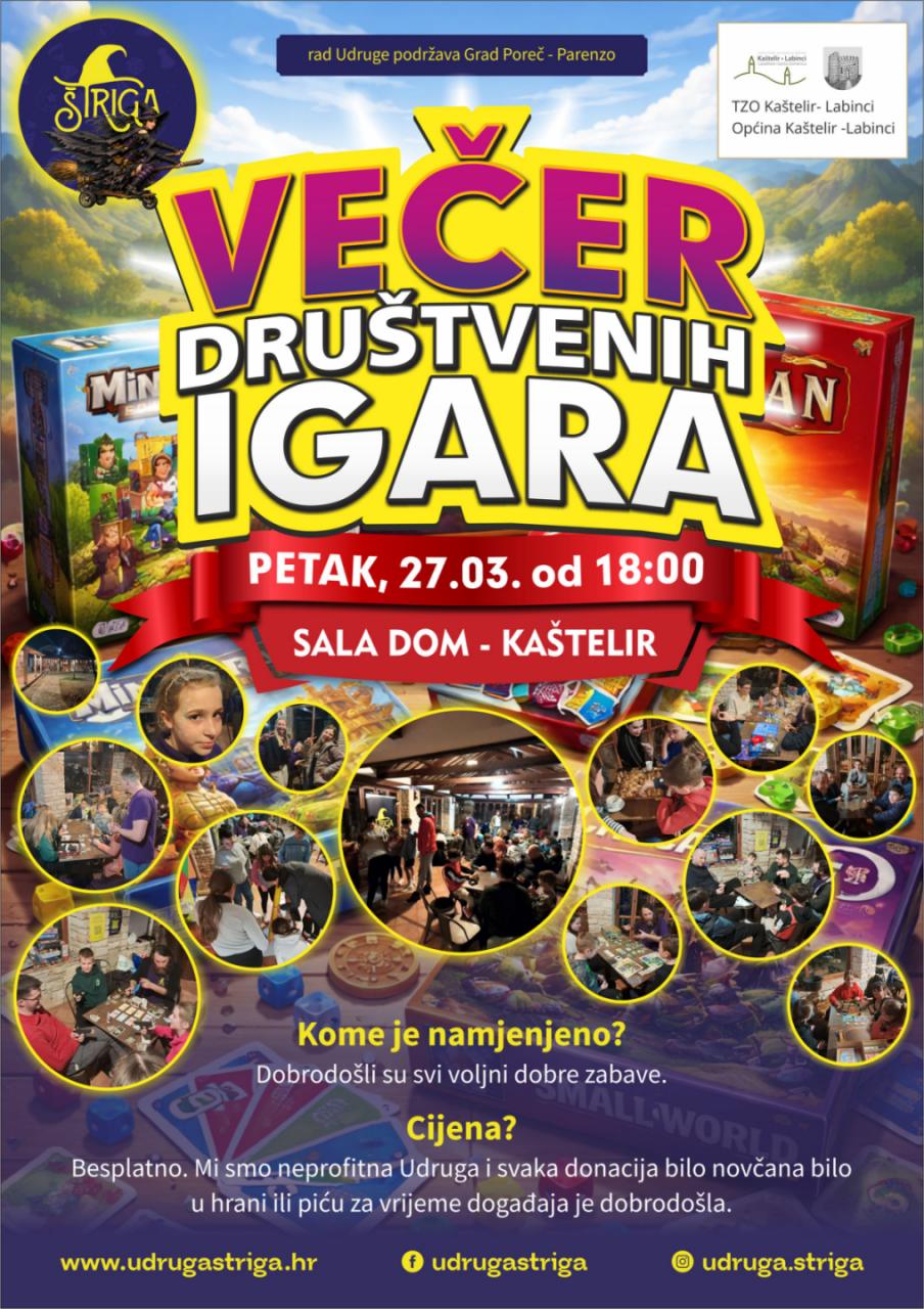 Ovaj put se družimo u toplini sale Dom Kaštelir, gdje ćemo ponovno izvući najbolje društvene igre iz naše škrinje. Bez obzira jeste li iskusni strateg ili samo tražite dobru zabavu i novo društvo, naša vrata su vam otvorena!