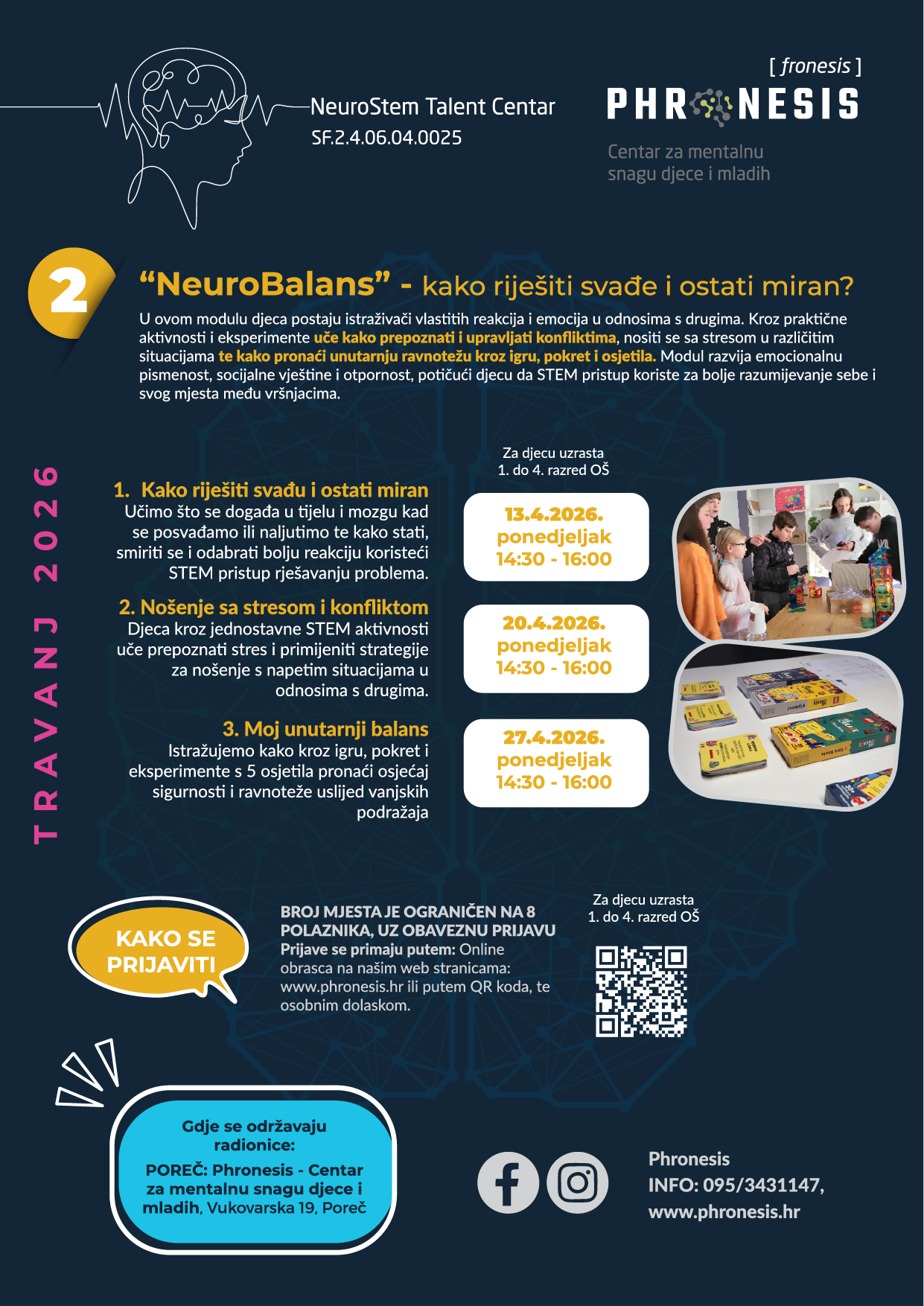 Tijekom travnja provodi se i modul „NeuroBalans“, usmjeren na razvoj vještina nošenja s konfliktima, stresom i intenzivnim emocijama. Kroz tri povezane radionice: kako riješiti svađu i ostati miran, nošenje sa stresom i konfliktom te moj unutarnji balans, za učenike od 1. do 4. razreda osnovne škole (13., 20. i 27. travnja od 14:30 do 16:00), djeca uz STEM način istraživanja sebe, uče kako prepoznati prve znakove napetosti, regulirati reakcije i razviti konstruktivne načine rješavanja problema. Od razumijevanja impulzivnih reakcija do razvoja unutarnjeg balansa, ovaj modul pruža konkretne alate primjenjive u svakodnevnim situacijama.