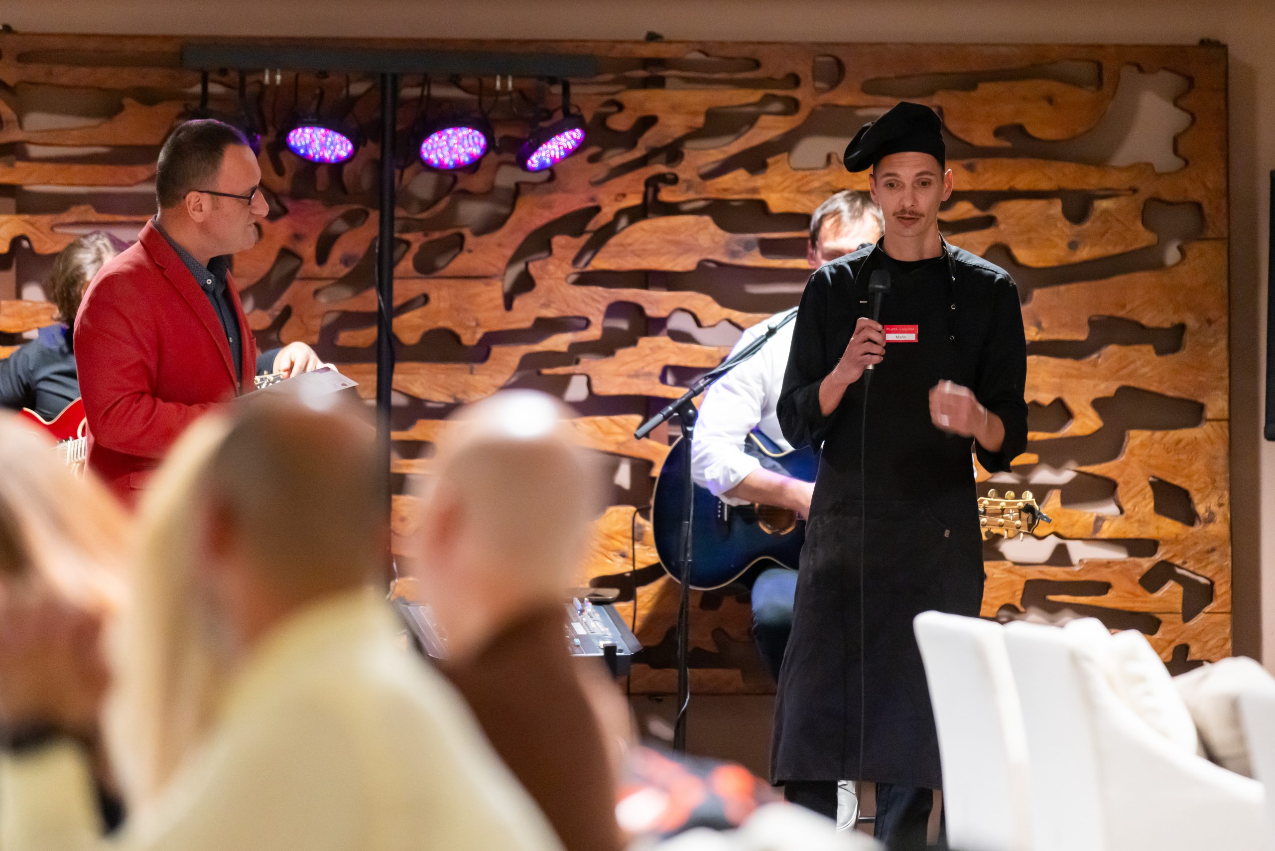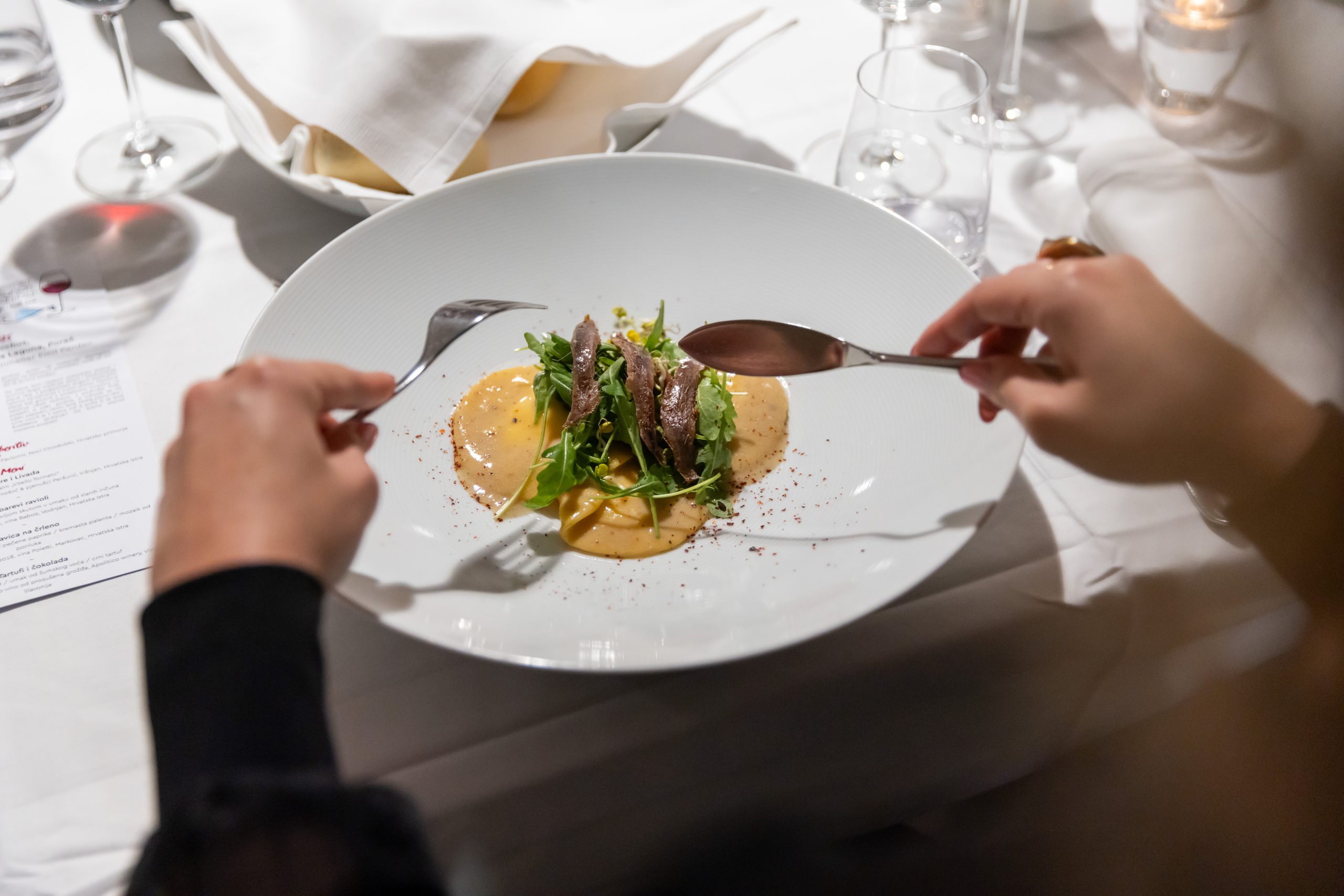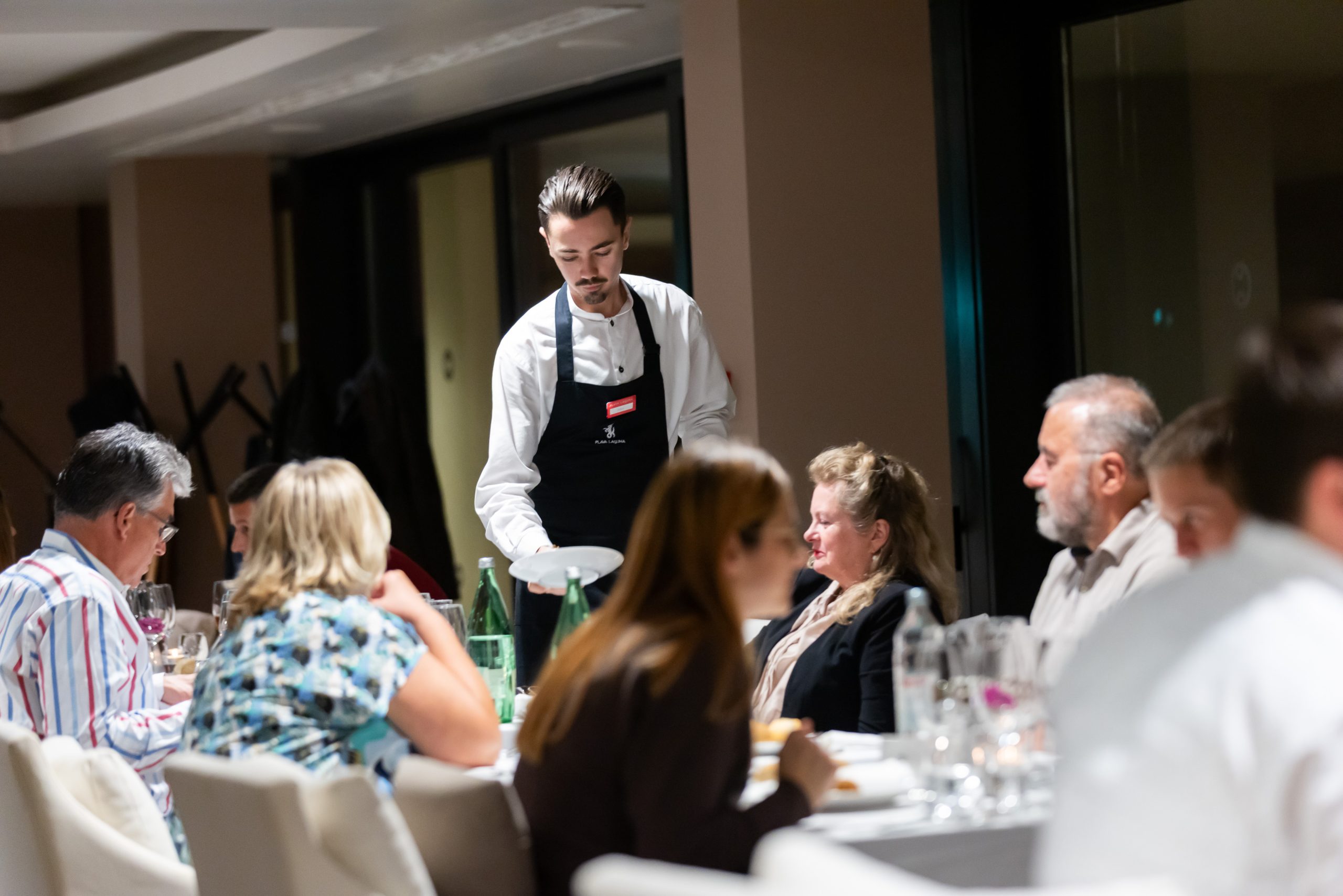 Uslijedili su Ribarevi ravioli – domaći ravioli punjeni finom kravljom skutom u aromatičnom umaku od slanih inćuna, uz čašu kupaže „Marana“ iz 2021. vinarije Babos iz Vodnjana. Glavno jelo, pod nazivom Plavica na črleno, oduševilo je goste skladom okusa: file lokarde poslužen s umakom od pečene paprike, kremastom palentom i mozaikom od poriluka, uz Cabernet Sauvignon iz 2018. godine vinarije Poletti iz Markovca.