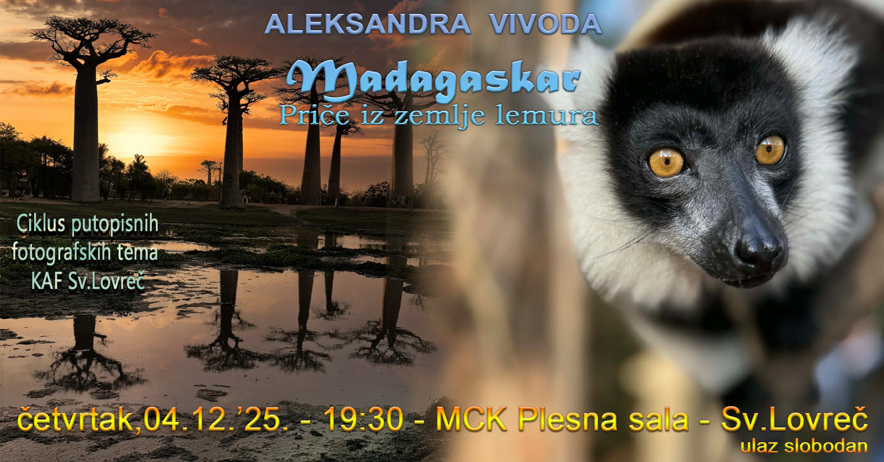 U četvrtak , 4.12. u 19:30 u MCK ‘Plesna sala’ u Sv.Lovreču fotografkinja, pustolovka, planinarka, putoholičarka, članica KAF-a, Aleksandra Vivoda, vodi nas u egzotični svijet Zemlje lemura – Madagaskar!