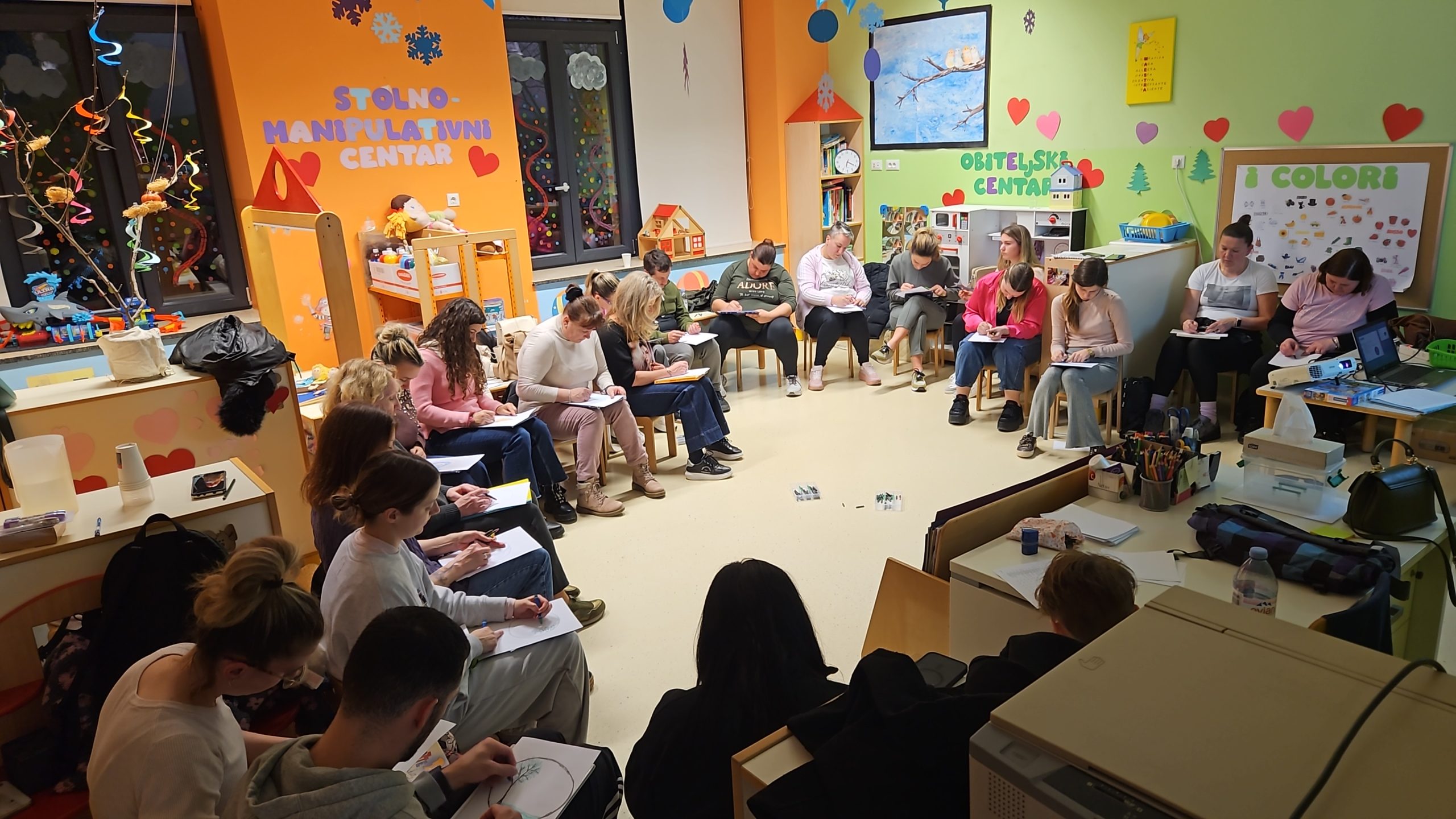 Cilj radionice bio je osnažiti stručne djelatnike za prepoznavanje i razumijevanje vlastitih reakcija na stres te ih upoznati s kreativnim i primjenjivim tehnikama regulacije u svakodnevnom radu s djecom. Kroz teorijski dio sudionici su se upoznali s osnovama funkcioniranja stresnog odgovora, razlikom između akutnog i kroničnog stresa te konceptom „prozora tolerancije“, odnosno osobnog kapaciteta za nošenje sa zahtjevnim situacijama. Poseban naglasak stavljen je na različite stilove suočavanja sa stresom – usmjerenost na problem, na emocije te na promjenu perspektive – uz poruku da je fleksibilnost i svjesna samoregulacija ključ profesionalne otpornosti u radu s djecom i roditeljima.