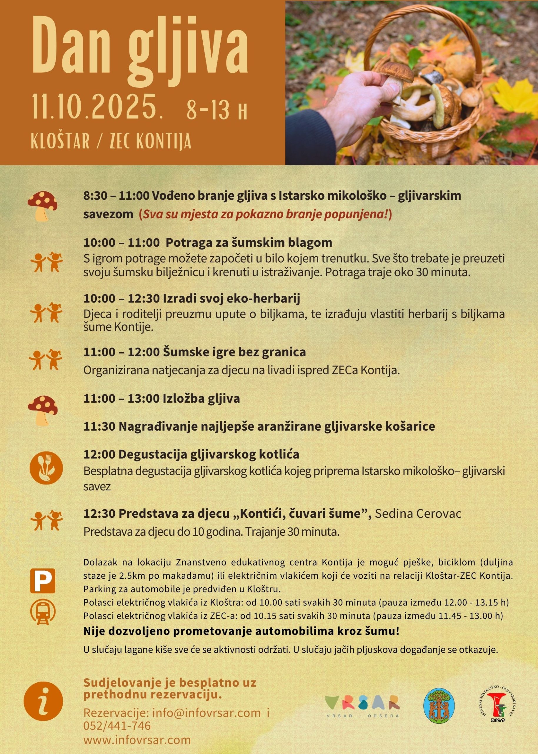 Dan će započeti vođenim branjem gljiva s članovima Istarskog mikološko-gljivarskog saveza (sva su mjesta za branje već popunjena), a od 11 sati posjetitelji mogu razgledati izložbu gljiva ispred Znanstveno-edukativnog centra Kontija. U podne slijedi degustacija gljivarskog kotlića, besplatna za sve.