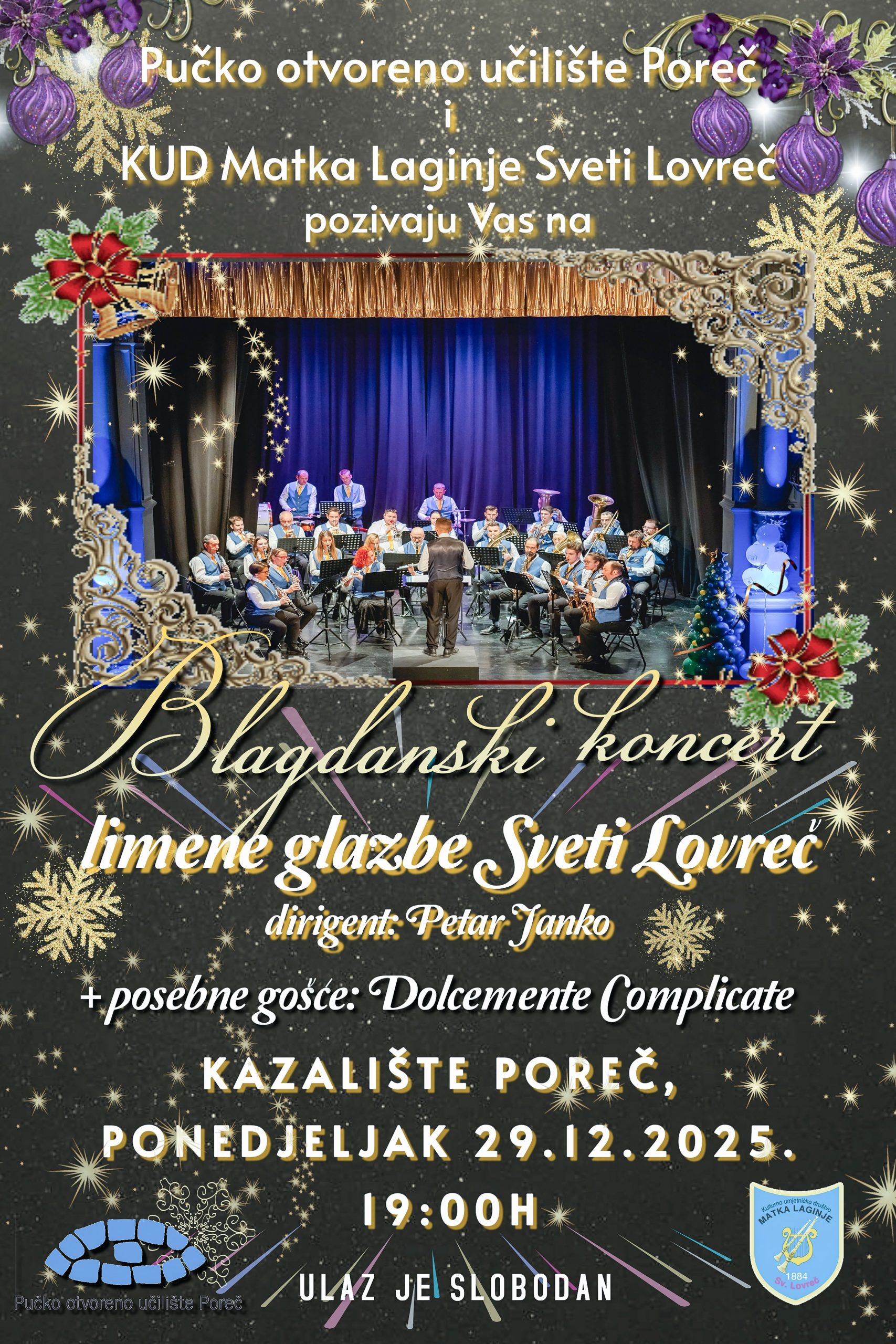 Završni ovogodišnji blagdanski koncert limena glazba iz Svetog Lovreča zaključit će u porečkom kazalištu, u ponedjeljak, 29.12.2025., s početkom u 19 sati.