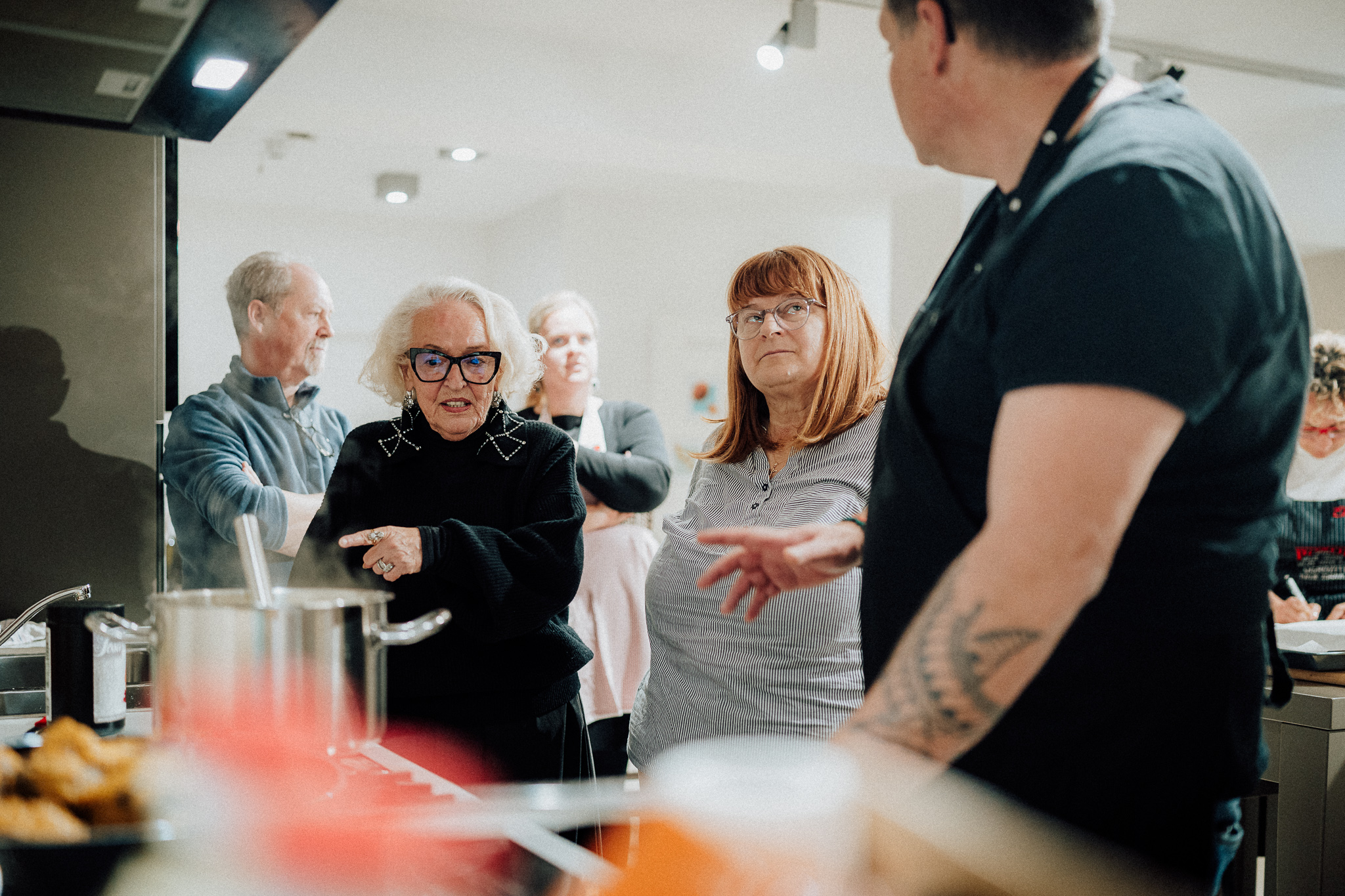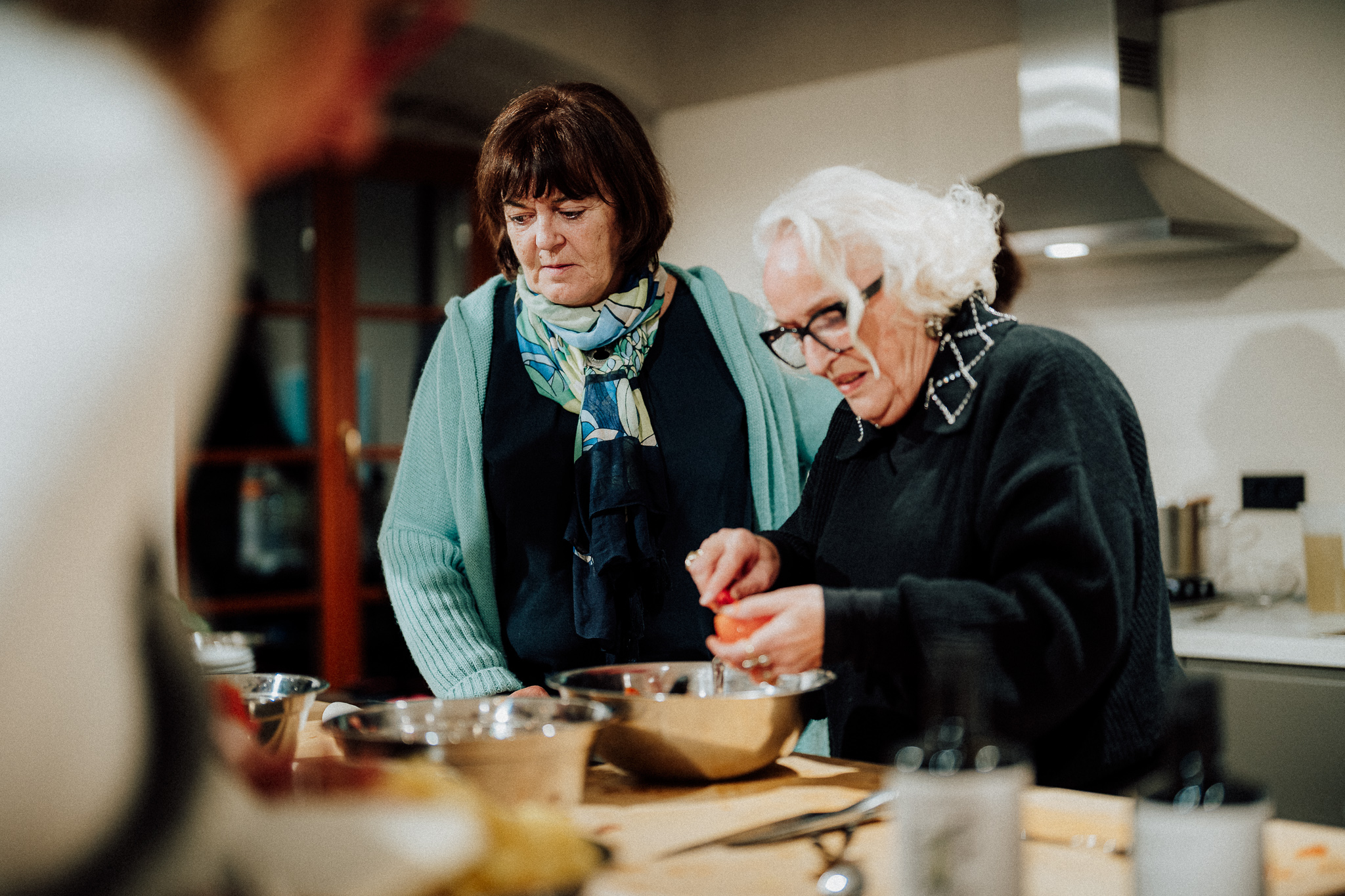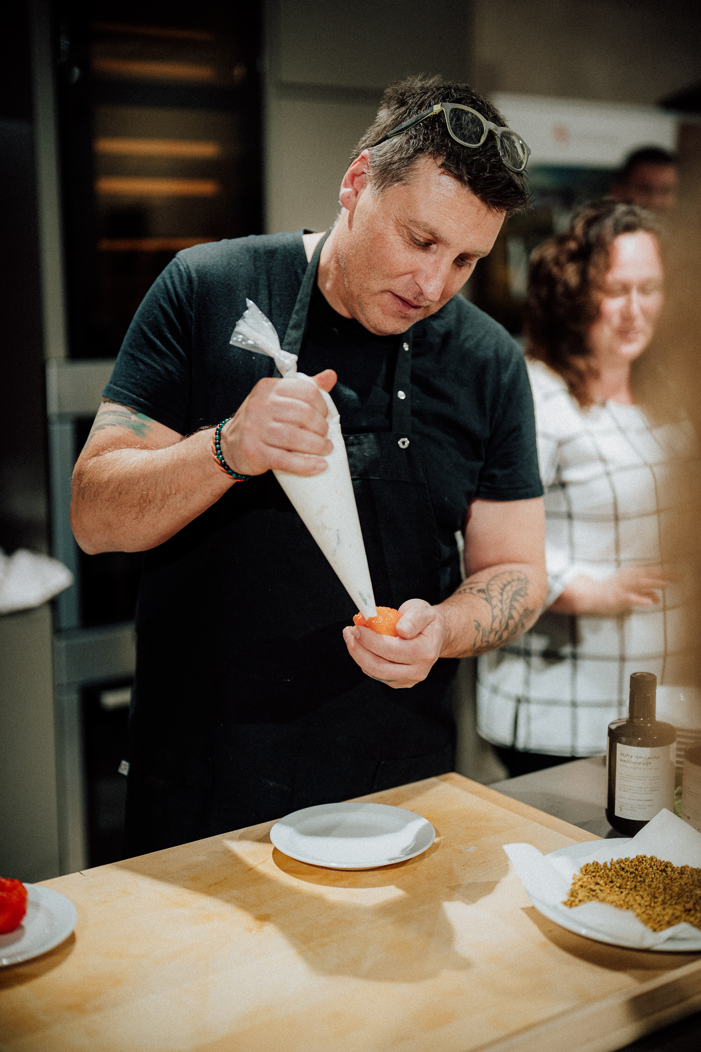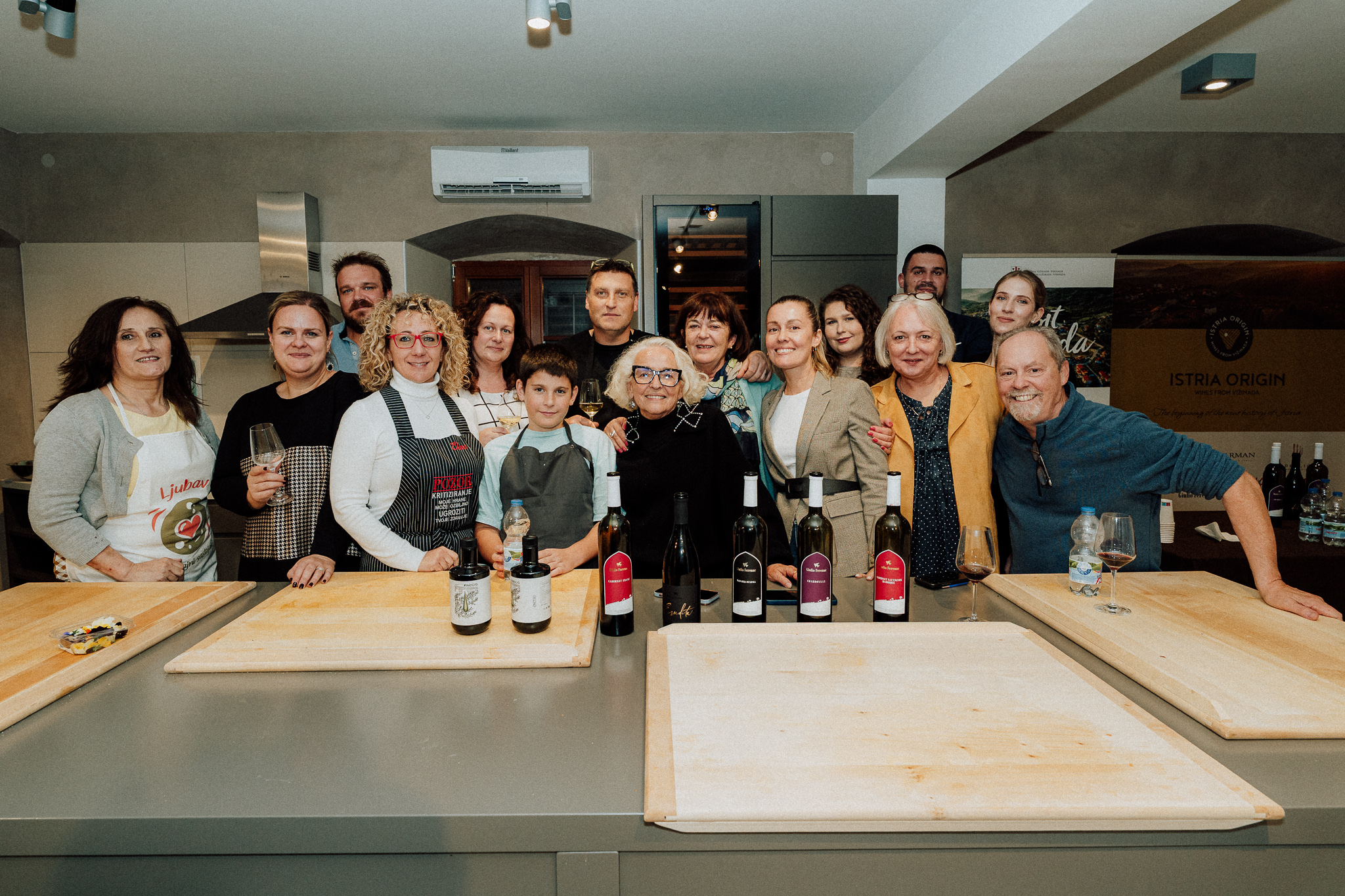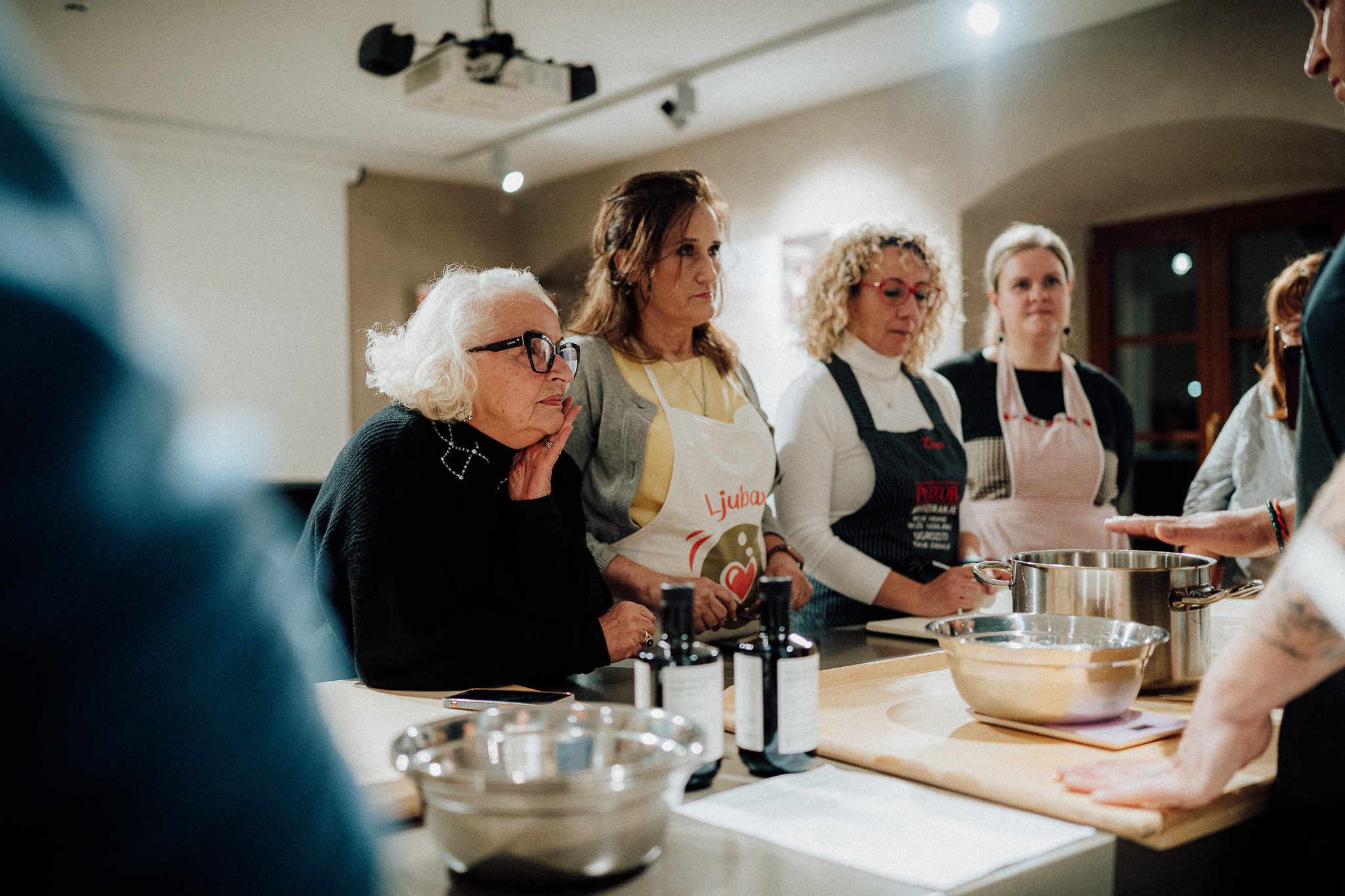 Polaznici su uživali u opuštenoj atmosferi, finim mirisima i kreativnom kuhanju, uz vinsku pratnju Giulio Ferenac Wines i maslinova ulja Rinolio. Pripremala su se maštovita jela poput rajčice punjene burratom s tostiranim pistaciom, sporo kuhanih junećih obrazina na kremi od krumpira s hrskavim guancialeom temillefoglie kao slatki završetak. Večer je protekla u odličnom raspoloženju, a fotografije najbolje govore koliko se uživalo.