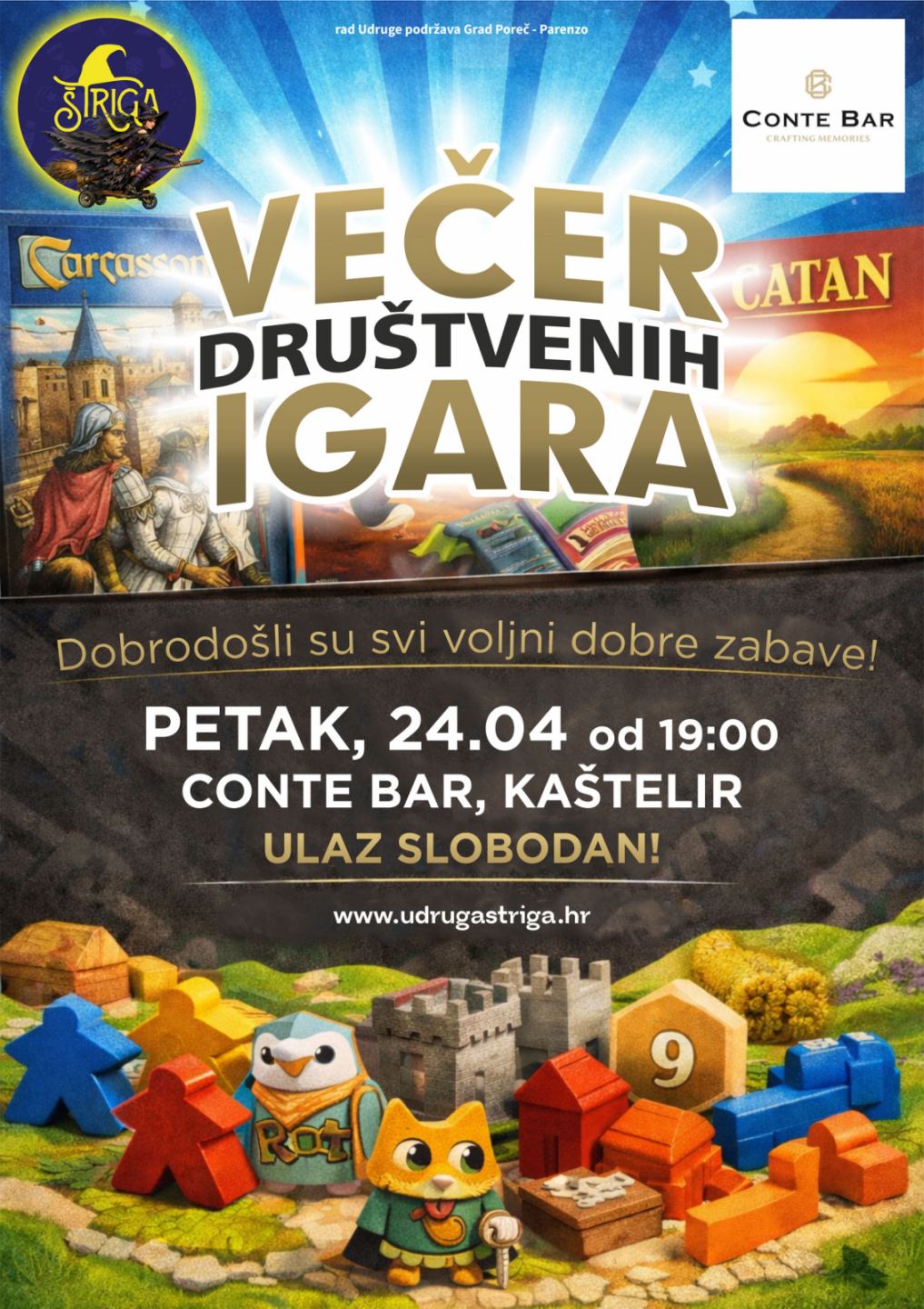 Udruga Štriga, u suradnji s domaćinima iz Conte Bara, poziva vas na još jedno druženje uz kocke, karte i ploče! Vidimo se ovog petka, 24. travnja 2026., s početkom u 19:00 sati.