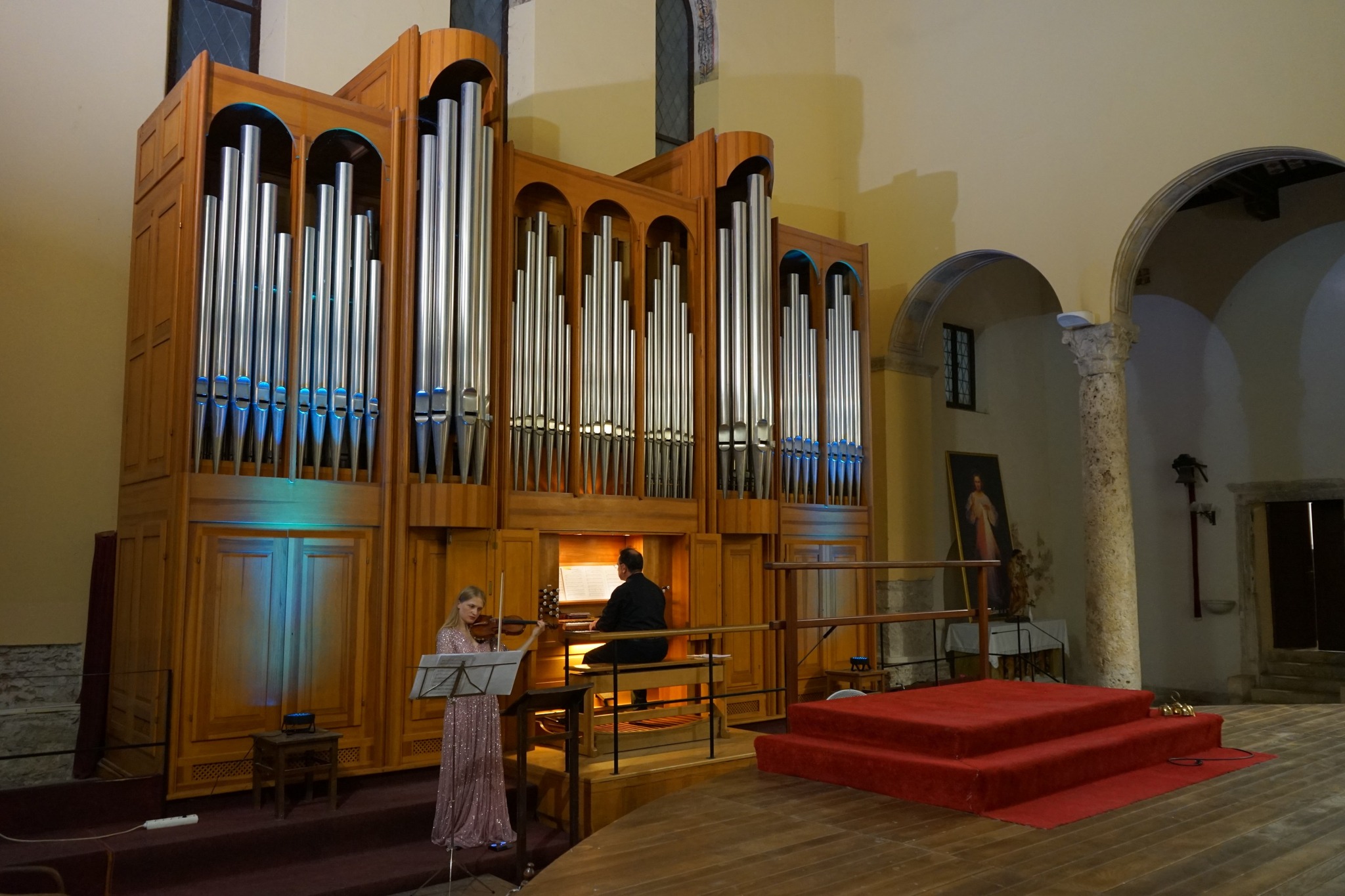 Već idućeg vikenda, 30. kolovoza u prepunoj pulskoj Katedrali dogodio se, kao što i sam naslov ”Conventus coeli et chordarum” govori, nebeski susret žica i kraljice instrumenata. Tako to i biva kada se u glazbi sastanu jedan od najaktivnijih talijanskih koncertnih orguljaša i mlada virtuozna violinistica u naponu snage. Salvatore Pronestì i Oleksandra Fedosova svojim pažljivim odabranim programom koji je bio protkan dirljivim, pjevnim melodijama ispunili su srca posjetitelja koji su bili oduševljeni bogatim zvukom koji se širio ovim velebnim prostorom. Lokacija ovog jedinog modernog, mehaničkog instrumenta Istre je podosta nezahvalna – zbog pozicije iza oltara umjetnicima je teško komunicirati, a zvuk je zbog volti iznad prezbiterija uvijek pomalo prigušen. No, ovaj put Katedrala je odjekivala kao nikada prije, orgulje su pjevale pod prstima izvanrednog orguljaša, improvizatora i poznavatelja prvenstveno talijanske glazbe, a violina je zvučala toplo i moćno. Fedosova, iako veoma samozatajna i skromna, oduševila je svojom tehničkom preciznošću, gracioznim ukrasima, nevjerojatnom agogikom i intonacijom, unatoč činjenici da je temperament ovih orgulja nešto viši od standardnog, što uglavnom stvara poteškoće. Također, publika je mogla uživati u plemenitom zvuku posebnog instrumenta – violine iz 19. st. koju je izgradio čuveni Giuseppe Rocca. Na programu su se našli nezaobilazni kompozitori Arcangelo Corelli, Giuseppe Tartini i Johann Sebastian Bach, dok je slušatelje posebno oduševila intrigantna Ciaconna građena na ”lamentnom basu”. Zahtjevnost baroknog glazbenog jezika razbili su kraći komadi talijanskih kasnijih autora izrazito romantičarskih manira, što je uglavnom opće prihvatljivo širem dijapazonu slušatelja i jedan od ciljeva ovog projekta – privući širu publiku i zaintrigirati ih za slušanje klasične glazbe, posebno one uz orgulje. Salvatore Pronesti predstavio se i improvizacijom, pridružujući se mnogim orguljašima koji i dalje aktivno posvećuju pažnju i njeguju ovu, nekada imperativnu, vještinu glazbenika.